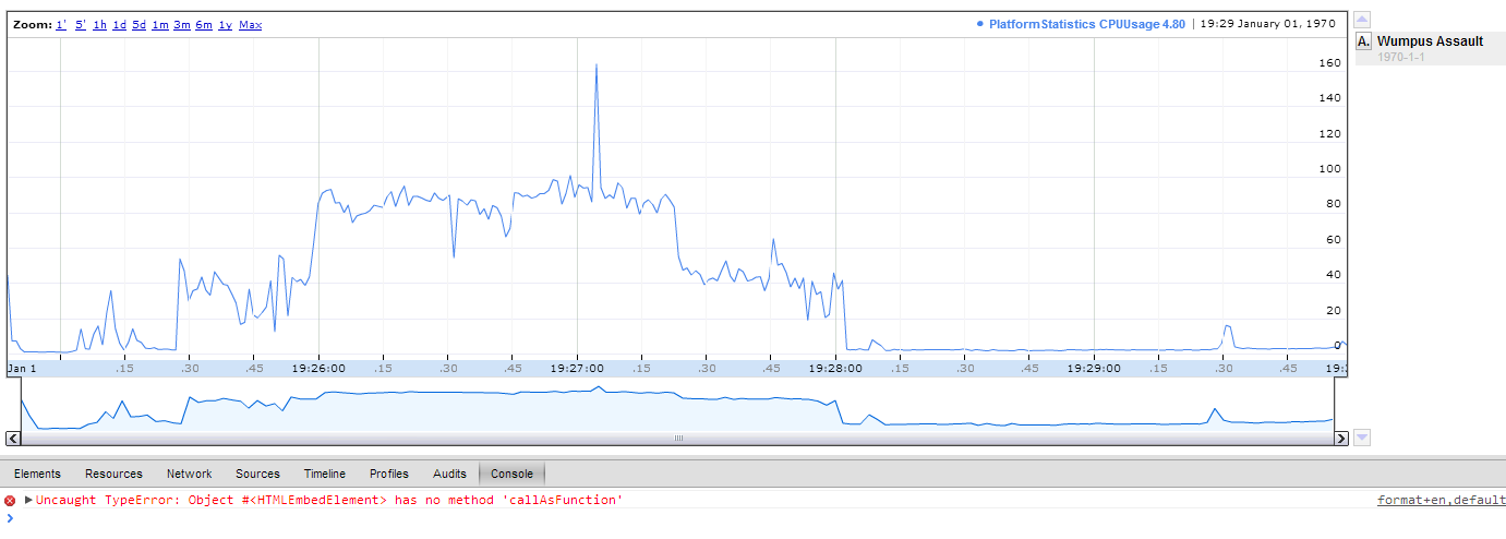 On Tuesday, July 2, 2013 8:58:35 PM UTC+8, Log Reader wrote: > > > <https://lh3.googleusercontent.com/-v_ma5HXwtbA/UdLMbma-u3I/AAAAAAAAAAo/kWZyjyRLNAo/s1381/annotationError.png> > > This picture shows it all. The annotation appears in the list, but it is > not on the chart. When I click it, I get the following error: "Uncaught > TypeError: Object #<HTMLEbedElement> has no method 'callAsFunction' " > I build the data table procedurally. So I have the following calls: > > data.addColumn(timestamp); > data.addColumn(CPUUsage); > data.addColumn({type: 'string', role: 'annotation'}); // I have also tried > "data.addColumn('string', 'title1');" to no avail, the same behavior happens > for the data.addRow call I have two possibilities: > if the timestamp to be added matches the wumpus attack time stamp: > data.addRow([ ### (the timestamp in miliseconds), CPUUsage, 'wumpus attack') > if not: data.addRow(data.addRow([ ### (the timestamp in miliseconds), > CPUUsage, '') // I have also tried passing null for the third argument, > same behavior > > I'm not sure what I'm doing wrong. Can anyone shed some light on whats > going on here? > > > -- You received this message because you are subscribed to the Google Groups "Google Visualization API" group. To unsubscribe from this group and stop receiving emails from it, send an email to [email protected]. To post to this group, send email to [email protected]. Visit this group at http://groups.google.com/group/google-visualization-api. For more options, visit https://groups.google.com/d/optout.