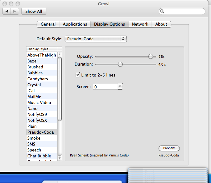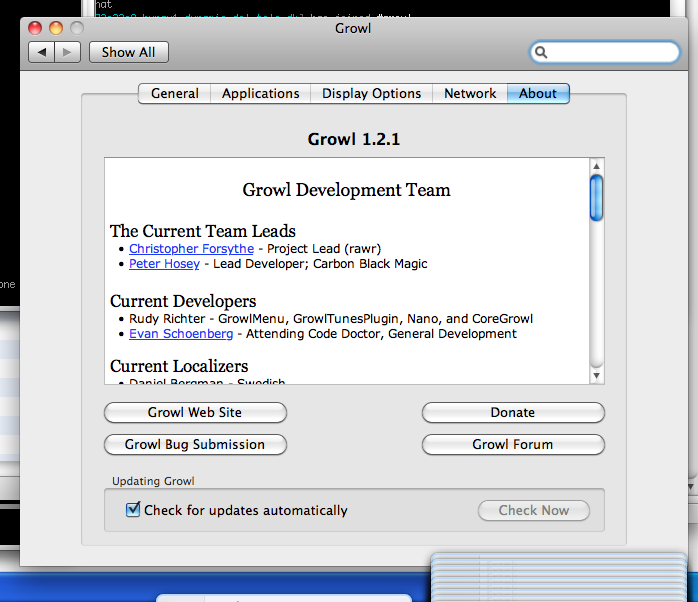 Screenshots at: http://www.justdave.net/growloffscreen.png http://www.justdave.net/growloffscreen1.png Those are showing the bottom-right corner of the screen. I had already closed the notifications that were actually visible on the screen. Growl 1.2.1 Mac OS X 10.6.4 Safari 5.0.2 The app that the majority of the notifications came from was Adium 1.4.1, but there were also quite a few that were posted by a remote growlnotify script on another machine. The display style in use was Psuedo-Coda (shown in one of the screenshots) -- You received this message because you are subscribed to the Google Groups "Growl Discuss" group. To post to this group, send email to [email protected]. To unsubscribe from this group, send email to [email protected]. For more options, visit this group at http://groups.google.com/group/growldiscuss?hl=en.
