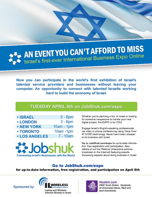 In advance of the April 8th Online International Israel Job Expo, the following articles/press release/flyer has been written about www.JobShuk.com . http://www.israelnationalnews.com/News/News.aspx/125773 http://www.thejewishpress.com/displaycontent_new.cfm?contentid=30661&mode=a http://jobshuk.com/uploads/assets/Zvi/ExpoRelease.doc http://jobshuk.com/uploads/assets/Zvi/expo.jpg Messages and opinions expressed on Hasafran are those of the individual author and are not necessarily endorsed by the Association of Jewish Libraries (AJL) =========================================================== Submissions for Ha-Safran, send to: Hasafran @ lists.acs.ohio-state.edu SUBscribing, SIGNOFF commands send to: Listproc @ lists.acs.ohio-state.edu Questions, problems, complaints, compliments;-) send to: galron.1 @ osu.edu Ha-Safran Archives: Current: http://www.mail-archive.com/hasafran%40lists.acs.ohio-state.edu/maillist.html History: http://www.mail-archive.com/hasafran%40lists.acs.ohio-state.edu/history.html AJL HomePage http://www.JewishLibraries.org
