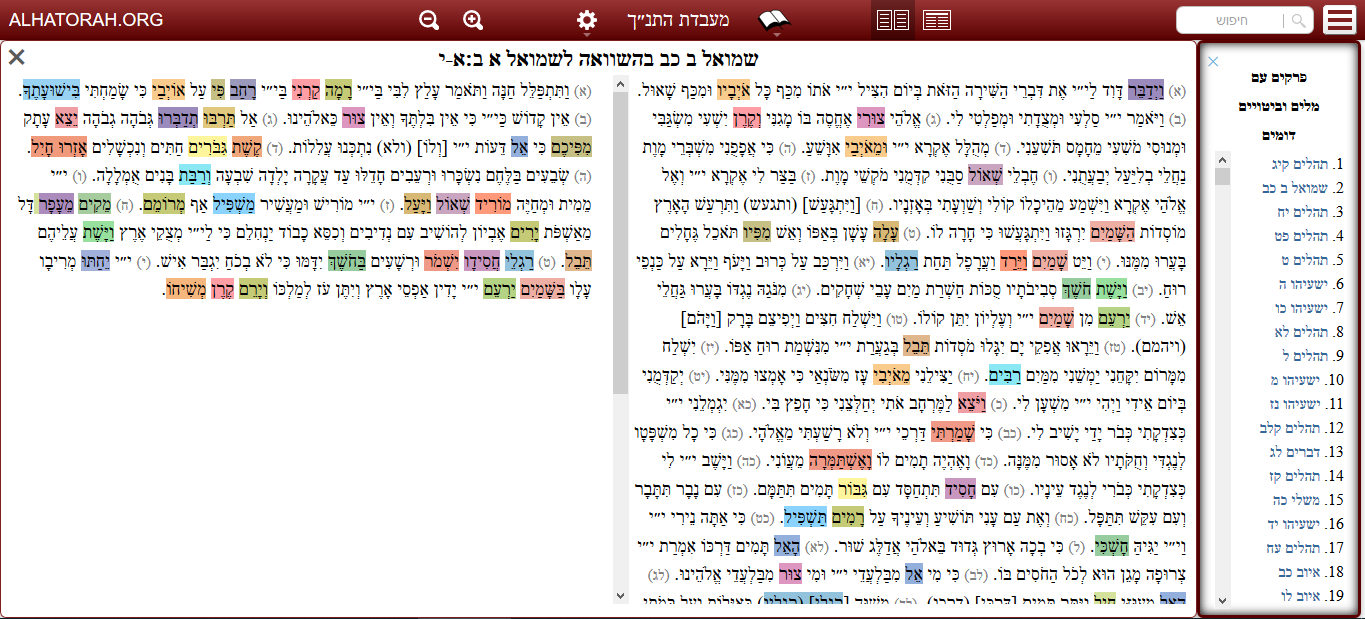 Shanah Tovah to All, ALHATORAH.ORG is excited to introduce TANAKH LAB, a tool which will hopefully be of great benefit for those who love and study Tanakh. Simply select any passage in Tanakh, and Tanakh Lab helps you: (1) Identify its keywords and key phrases. (2) Obtain comparative stats for their frequency in the rest of Tanakh so that you can evaluate their significance in your unit. (3) Highlight other literary phenomena using its coloring palette. (4) Most importantly, pressing the TORAH icon provides a list of the chapters in Tanakh which have lexical/literary similarities to your unit. Clicking on the various links allows you to compare any of the units side by side, and opens the door for new connections and insights. As starters, here are a couple of examples from upcoming and recent Torah readings: http://mg.alhatorah.org/TanakhLab/Vayikra/16/1/16/34 http://mg.alhatorah.org/TanakhLab/Shemuel_I/2/1/2/10 and here is a screenshot of the compare tool: http://mg.alhatorah.org/MikraotGedolot/pages/Media/TanakhLab/ShemuelI2-ShemuelII22.png Additional options and filters are available in the Gear menu, and for a complete guide to the lab's features see: http://mg.alhatorah.org/TanakhLab_Guide. Tanakh Lab is part of a growing array of Torah resources freely available at AlHaTorah.org's customizable online Mikraot Gedolot (http://mg.alhatorah.org) and main site (http://alhatorah.org). To stay updated as new resources go live, subscribe at: http://alhatorah.org/Subscribe. Enjoy and please remember to share some of what you find with us and others! Gemar Chatimah Tovah, Hillel Novetsky (for ALHATORAH.ORG) |