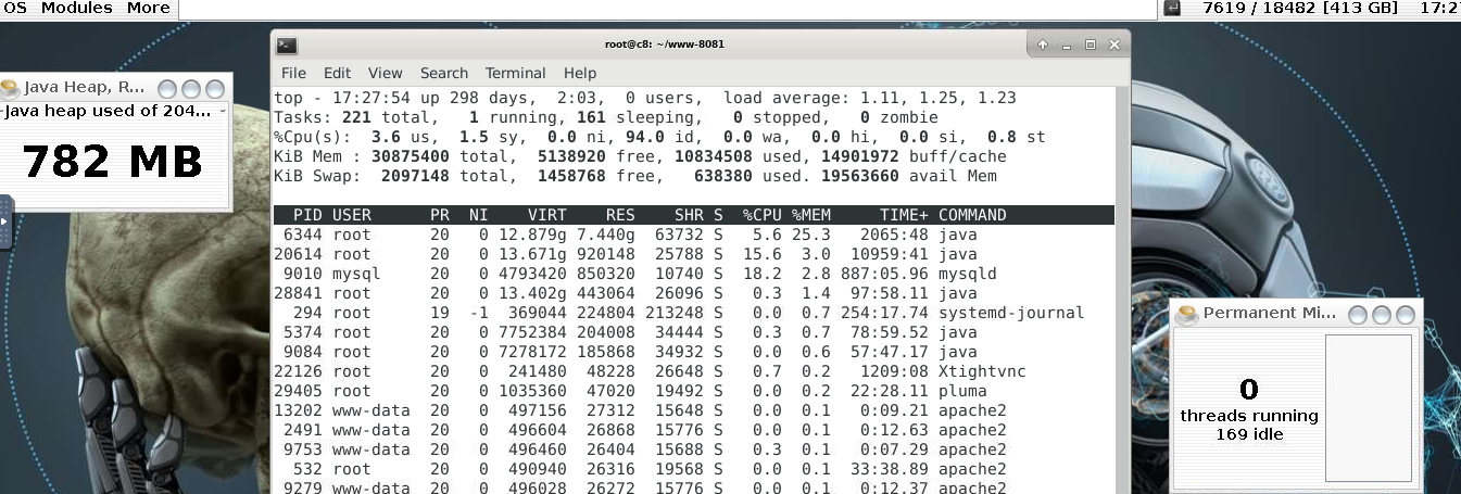 Yeah I gotcha... here it is: root@c8:~# ps -aef|grep 6344 root 6344 1 24 Mar22 ? 1-10:46:31 java --illegal-access=permit -Xmx2g --add-opens java.base/jdk.internal.loader=ALL-UNNAMED --add-opens java.base/jdk.internal.module=ALL-UNNAMED --add-opens java.base/jdk.internal.ref=ALL-UNNAMED --add-opens java.base/java.lang.module=ALL-UNNAMED --add-opens java.base/jdk.internal.reflect=ALL-UNNAMED -jar /root/.javax/x30.jar 1013896