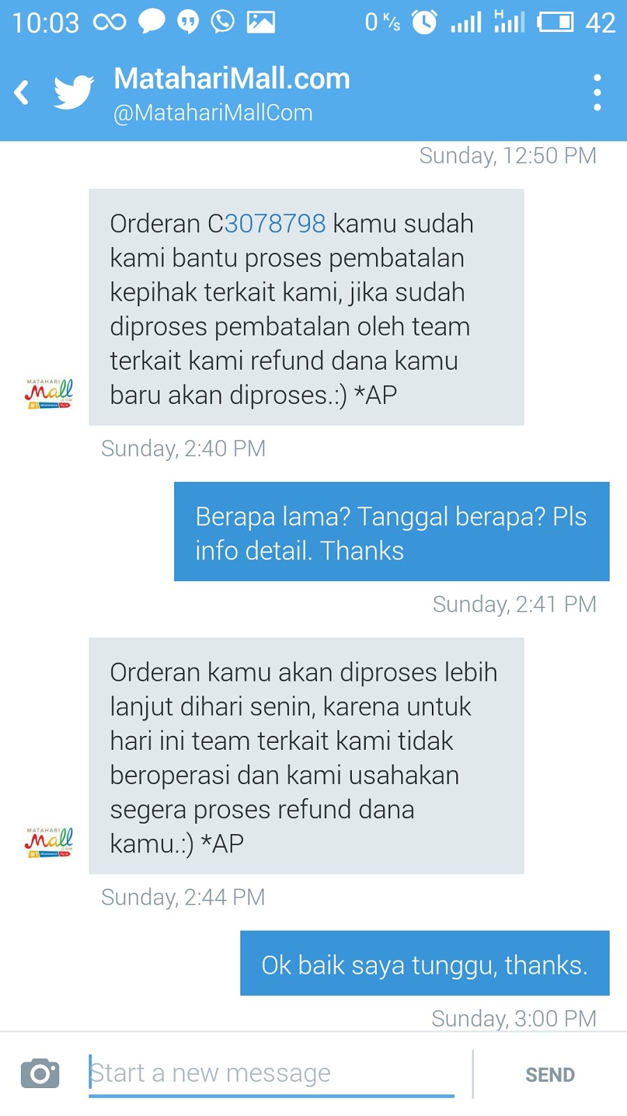 Maksud hati mau ngirit, hasilnya malah nyelekit. Mungkin kalimat ini pantas > mengawali tulisan saya kali ini. Apanya yang diirit? Dan bagaimana bisa > jadi nyelekit? Kita bahas sesuai kronologis kejadiannya saja yuk. > Awal mulanya sih gara-gara baca tweetnya Sepulsa.com > <https://www.sepulsa.com/referral/2f778f6c> bahwa sekarang voucher diskon > MatahariMall.com <http://www.mataharimall.com/> sudah tersedia jika kita > mengisi pulsa di sana. Hmm, saya pikir boleh juga nih cari diskonan buat > beli gadget yang mau saya coba selanjutnya. Asiknya lagi, walau cuma isi > pulsa Rp 25.000, tapi dapat voucher diskonMatahariMall.com > <http://www.mataharimall.com/>-nya senilai Rp 100.000 lho, dengan minimum > pembelanjaan sebesar Rp 300.000. > Saat pertama membaca profil e-Commerce ini, saya senang sekali. Wah ada > tempat belanja online baru yang lagi bakar duit dengan sering-sering > memberi voucher diskon kepada pelanggannya. Belum lagi nama-nama beken di > belakang layarMatahariMall.com <http://www.mataharimall.com/>. Mulai dari > bergabungnya pendiri Zalora Indonesia, Hadi Wenas, ex-Country Manager > Google Indonesia, Rudy Ramawy hingga ex-CEO Garuda Indonesia, Emirsyah > Satar menjadi sosok di belakang nama MatahariMall.com > <http://www.mataharimall.com/>. Selengkapnya dapat dibaca di artikel > DailySocial yang ini > <https://dailysocial.net/post/hadi-wenas-didapuk-sebagai-ceo-mataharimall-com> > . > Nah, kebetulan saya pengen membuktikan bahwa kartu Smartfren 4G dapat > digunakan di Meizu M2 Note > <http://www.gontagantihape.com/2015/08/deep-review-meizu-m2-note-indonesia.html>, > jadilah saya memutuskan untuk membeli sebuah Modem Smartfren Andromax 4G > M2P yang aslinya diproduksi oleh Huawei. Dapat satu-satunya modem tersebut > yang dijual di MatahariMall.com <http://www.mataharimall.com/> oleh > KZShop seharga Rp 449.000. Lebih mahal Rp 50.000 memang dari harga > resminya, namun toh saya punya voucher diskon Rp 100.000 plus > MatahariMall.com <http://www.mataharimall.com/> masih memberlakukan promo > bebas biaya kirim ke seluruh Indonesia, jadinya cincai deh pikir saya kala > itu. > Pesanan saya selesaikan dan langsung saya bayar melalui transfer ke salah > satu rekening yang disediakan oleh MatahariMall.com > <http://www.mataharimall.com/>. Proses konfirmasi pembayaran masih manual > melalui sebuah form yang disediakan di webnya MatahariMall.com > <http://www.mataharimall.com/>, namun dari mulai melakukan konfirmasi > hingga pembayaran sukses terverifikasi tidak membutuhkan waktu lama koq, > wah sip deh tinggal tunggu pesanan datang kalau begitu. > Metode pembayaran yang saat itu tersedia baru pembayaran melalui kartu > kredit dan bank transfer saja. Maklum, e-Commerce yang satu ini masih dalam > tahap Beta, dapat dilihat pada logo di websitenya yang masih berlabel beta. > Konon nantinya beberapa metode pembayaran akan ditambahkan, termasuk > pembayaran dan pengambilan secara offline di outlet-outlet Matahari. Cukup > menarik! Saya berharap pembayaran instan semacam Mandiri ClickPay, > CIMBClicks, atau BCA KlikPay dapat segera didukung oleh mereka. > Oh ya, nomor pesanan saya waktu itu adalah C3078798 pada tanggal *26 > Agustus 2015*. Pada tanggal yang sama, saya melakukan beberapa transaksi > di e-Commerce lain juga. Bahkan sebetulnya modem yang saya butuhkan > sebetulnya dijual di e-Commerce lain tersebut dengan harga jual yang lebih > murah dari harga normal, hanya saja masih lebih murah di MatahariMall.com > <http://www.mataharimall.com/> dikarenakan faktor voucher diskon dan > bebas ongkos kirim. > Ketika tanggal *27 Agustus 2015* pesanan-pesanan saya mulai berdatangan, > saya cek pesanan saya di MatahariMall.com <http://www.mataharimall.com/> belum > berubah statusnya, masih *pending shipment *alias menunggu pengiriman. > Saya kemudian ingat, dulu pernah membeli *smartwatch* di MatahariMall.com > <http://www.mataharimall.com/> dan statusnya pun lama tidak berubah > sampai akhirnya saya cari info kontak penjualnya langsung di Google, dan > kirim e-mail kepada penjual untuk segera memproses orderan saya di > MatahariMall.com <http://www.mataharimall.com/>. Barulah orderan saya > diproses dan sampai di tangan saya beberapa hari kemudian. Perkiraan saya > sih, sepertinya para *seller *diMatahariMall.com > <http://www.mataharimall.com/> belum rajin *login *untuk mengecek > pesanan, mungkin karena e-Commerce ini masih baru, belum rilis resmi secara > besar-besaran, sehingga jumlah transaksinya pun masih sedikit. > Masalahnya, KZShop tidak bisa saya temukan kontaknya di manapun haha. > Bahkan setelah saya cek lagi di MatahariMall.com > <http://www.mataharimall.com/>, barang yang dijualnya pun hanya satu > buah, modem yang saya pesan itu. Gawat saya pikir, bisa ngendon lama ini > mah pesanan saya. Akhirnya iseng saya mention ke twitter handle > @MatahariMallCom <http://www.twitter.com/MatahariMallCom>yang kemudian > diminta menginfokan nomor pesanan melalui Direct Message. > Pada tanggal *28 Agustus 2015*, Direct Message saya dibalas dengan jawaban > *template*, untuk pesanan luar Jabodetabek diharap menunggu selama 7-14 > hari sesuai prosedur. Wow, lama sekali! > > <http://3.bp.blogspot.com/-QpBdggsT-rU/VeZ4VvUeNOI/AAAAAAAABk8/rKB4UgmaWUI/s1600/S50902-100210.jpg> > > Hari *Minggu tanggal 30 Agustus 2015*, saya cek kembali dan statusnya > masih sama. Sepertinya seller memang tidak memproses pesanan saya atau > malah tidak pernah login lagi ke MatahariMall.com > <http://www.mataharimall.com/> nampaknya. Kalau sudah begini, fitur yang > menginformasikan kapan seller terakhir login seperti yang ada di Tokopedia > <http://www.tokopedia.com/> danBukalapak <http://www.bukalapak.com/> terasa > sekali manfaatnya ya. > Akhirnya saya utarakan keinginan saya untuk membatalkan pesanan melalui > Twitter lagi. Customer Service-nya MatahariMall.com > <http://www.mataharimall.com/> sebetulnya cukup responsif, namun > jawabannya terasa janggal. Mereka menginfokan bahwa seller mereka hanya > beroperas