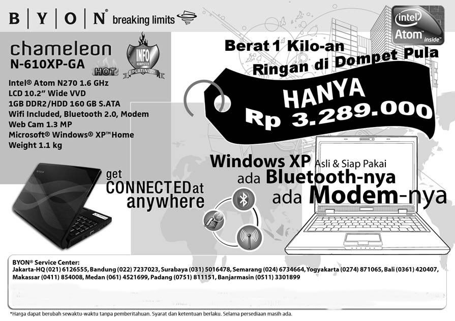 1. Byon Chameleon N-610XP-GA spek : Intel Atom N270 1.6GHz / 1GB / 160GB /