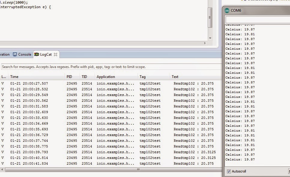 > Thanks for your prompt reply; > > So I'm going to pretend i did NOT swap ADD0 and ALT pins on the sensor. > > After much, pain - (I broke my whole dev environment updating sdk and my > low cost android cellphone do not seem to like the latest adb, reinstall > everything from scratch - while I was finalizing the fritzing pictures for > this post I had an horrible doubt, searched for multiple internet sources > and I wired my tmp102 the wrong way : after grounding pin ADD0 instead of > pin ALT all readings seem to be more in my acceptable range. 0.5°c > > > > <https://lh6.googleusercontent.com/-yeVKsNe18VM/VL_4xpRM7iI/AAAAAAAAAAM/qEFU_AR_SY0/s1600/readings_in_debug.jpg> > > > > <https://lh6.googleusercontent.com/-6r_UkudIXbA/VL_43ea5tnI/AAAAAAAAAAU/ExaaGaPmtfo/s1600/schematics.jpg> > > > > On Wednesday, January 21, 2015 at 7:05:44 AM UTC+1, Ytai wrote: >> >> >> 1. The 3.3V rail on the IOIO should be very stable, I don't think >> this is a likely problem. >> 2. Can you share your electrical diagram as well as a minimal app >> with which you're seeing the problem? >> 3. Is it possible that for some reason the sensor is actually indeed >> warmer than the reference with this setup? >> >> Since you're actually able to talk to the sensor, I find it hard to >> imagine what sort of conditions may cause reading an incorrect temperature. >> I've used this sensor pretty extensively in the past (both with and without >> the IOIO) and tend to trust it a lot. >> >> On Tue, Jan 20, 2015 at 1:07 AM, <[email protected]> wrote: >> >>> Hello, >>> >>> I'm having a hard time with TMP102 sensor. >>> >>> Thanks to Ytai code snippet conversion and register reading is correct. >>> >>> What is incorrect *seems *to be the sensor itself. >>> >>> Analog thermometer is used as a reference, and I get errors from 6° to >>> 1,5° in excess on the tmp102, In "ambient temperature" area (from 10°c to >>> 25°c) >>> I tested with another TMP102 sensor (also purchased from sparkfun, thus >>> with a different pin layout), the same weird behavior. >>> The error seems to be changing over time (As if the sensor needed 30+ >>> minutes to stabilize) but never disappears. At the time being I have set a >>> "-1.5" correction. >>> >>> The sensor is read every 5 seconds. >>> >>> >>> I tested the same tmp102 sensor on a arduino board (with a very fast >>> loop), and the readings are correct (well, within 0.2°c of the reference >>> thermometer). >>> >>> >>> >>> I wonder If the arduino fast loop helps the sensor reaching operational >>> conditions (let's call that warming up ?), and the 5 sec loop on the >>> android does not allow tmp102 to work properly. Or maybe my ioio power >>> supply is interfering (8 volts, 1000mah) with the tmp102 (sensor VCC is >>> plugged to 3v on the board itself). >>> >>> >>> I'm working on a thermostat, temperature reading reliability is rather >>> important. >>> >>> >>> I ordered an MCP9808 sensor to compare readings. >>> >>> Any idea, testing pattern or any "reliable" sensor to recommend ? >>> >>> >>> (BTW Ytai : Many, many thanks for your *great* work. ) >>> -- >>> You received this message because you are subscribed to the Google >>> Groups "ioio-users" group. >>> To unsubscribe from this group and stop receiving emails from it, send >>> an email to [email protected]. >>> To post to this group, send email to [email protected]. >>> Visit this group at http://groups.google.com/group/ioio-users. >>> For more options, visit https://groups.google.com/d/optout. >>> >> >> -- > You received this message because you are subscribed to the Google Groups > "ioio-users" group. > To unsubscribe from this group and stop receiving emails from it, send an > email to [email protected]. > To post to this group, send email to [email protected]. > Visit this group at http://groups.google.com/group/ioio-users. > For more options, visit https://groups.google.com/d/optout. > -- You received this message because you are subscribed to the Google Groups "ioio-users" group. To unsubscribe from this group and stop receiving emails from it, send an email to [email protected]. To post to this group, send email to [email protected]. Visit this group at http://groups.google.com/group/ioio-users. For more options, visit https://groups.google.com/d/optout.