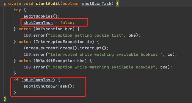 https://github.com/apache/bookkeeper/blob/b95c753a87a97114012e0af2b11972c3df01d48d/bookkeeper-server/src/main/java/org/apache/bookkeeper/replication/Auditor.java#L1040 Auditor#startAudit will set shutDownTask to false ,  and let https://github.com/apache/bookkeeper/blob/b95c753a87a97114012e0af2b11972c3df01d48d/bookkeeper-server/src/main/java/org/apache/bookkeeper/replication/Auditor.java#L1985 never do submitShutdownTask. ---------------------------------------------------------------- This is an automated message from the Apache Git Service. To respond to the message, please log on to GitHub and use the URL above to go to the specific comment. For queries about this service, please contact Infrastructure at: [email protected]