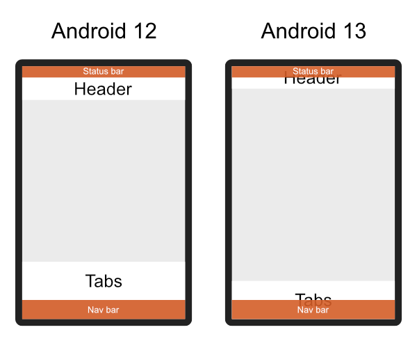 Since Android 13 the status bar and nav bar overlay the app content.  Cordova 11.0.0 Cordova Android 11.0.0 Ionic Angular 6.x -- This is an automated message from the Apache Git Service. To respond to the message, please log on to GitHub and use the URL above to go to the specific comment. To unsubscribe, e-mail: [email protected] For queries about this service, please contact Infrastructure at: [email protected] --------------------------------------------------------------------- To unsubscribe, e-mail: [email protected] For additional commands, e-mail: [email protected]