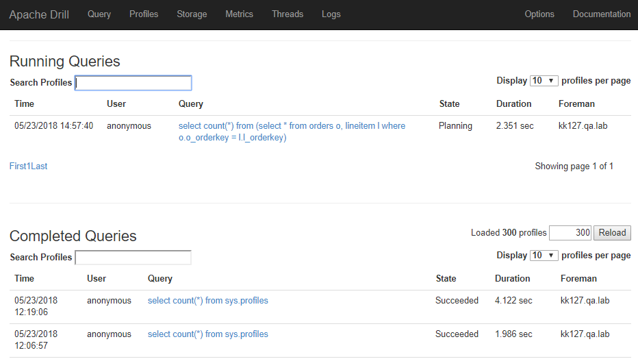 > When running a query in Drill, the {{/profiles}} page will show the search