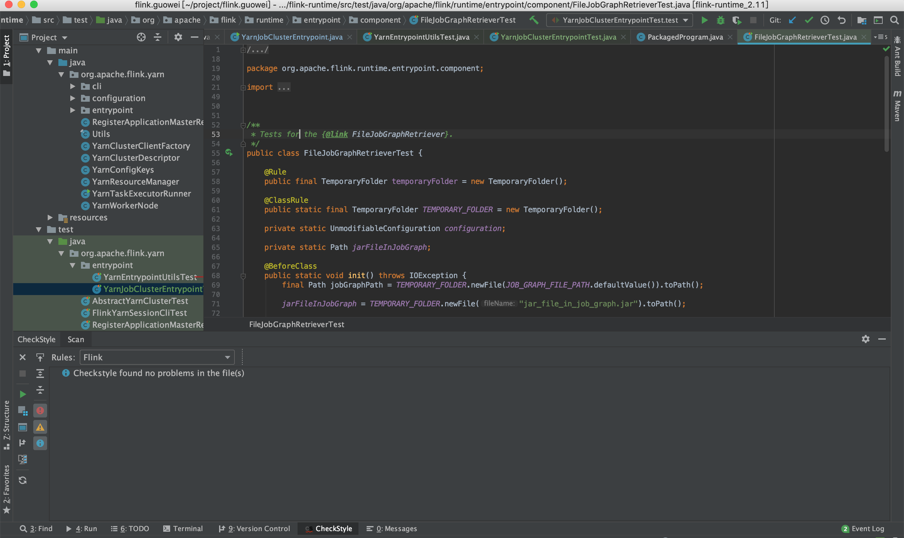 ########## File path: flink-runtime/src/test/java/org/apache/flink/runtime/entrypoint/component/FileJobGraphRetrieverTest.java ########## @@ -0,0 +1,114 @@ +/* + * Licensed to the Apache Software Foundation (ASF) under one + * or more contributor license agreements. See the NOTICE file + * distributed with this work for additional information + * regarding copyright ownership. The ASF licenses this file + * to you under the Apache License, Version 2.0 (the + * "License"); you may not use this file except in compliance + * with the License. You may obtain a copy of the License at + * + * http://www.apache.org/licenses/LICENSE-2.0 + * + * Unless required by applicable law or agreed to in writing, software + * distributed under the License is distributed on an "AS IS" BASIS, + * WITHOUT WARRANTIES OR CONDITIONS OF ANY KIND, either express or implied. + * See the License for the specific language governing permissions and + * limitations under the License. + */ + +package org.apache.flink.runtime.entrypoint.component; + +import org.apache.flink.api.common.JobID; +import org.apache.flink.configuration.Configuration; +import org.apache.flink.configuration.UnmodifiableConfiguration; +import org.apache.flink.runtime.jobgraph.JobGraph; +import org.apache.flink.runtime.jobgraph.JobVertex; +import org.apache.flink.util.FileUtils; +import org.apache.flink.util.FlinkException; + +import org.junit.BeforeClass; +import org.junit.ClassRule; +import org.junit.Rule; +import org.junit.Test; +import org.junit.rules.TemporaryFolder; + +import java.io.File; +import java.io.IOException; +import java.io.ObjectOutputStream; +import java.net.URL; +import java.nio.file.Files; +import java.nio.file.Path; +import java.util.ArrayList; +import java.util.Collections; +import java.util.List; + +import static java.nio.file.StandardOpenOption.CREATE; +import static org.apache.flink.runtime.entrypoint.component.FileJobGraphRetriever.JOB_GRAPH_FILE_PATH; +import static org.hamcrest.Matchers.containsInAnyOrder; +import static org.junit.Assert.assertThat; + + Review comment: It is very interesting. My ide does not report this issue. Maybe I need to update the checkstyle config. I will fix it.  ---------------------------------------------------------------- This is an automated message from the Apache Git Service. To respond to the message, please log on to GitHub and use the URL above to go to the specific comment. For queries about this service, please contact Infrastructure at: [email protected] With regards, Apache Git Services