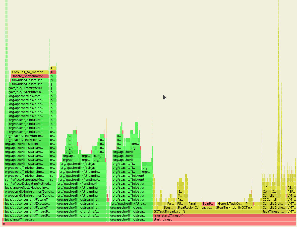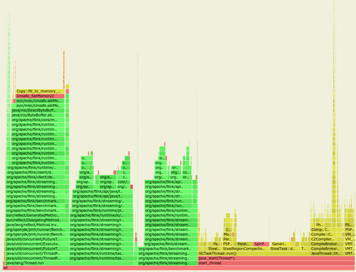 shuttie opened a new pull request #10529: [FLINK-15171] [serialization] fix performance regression caused by too many buffer allocations on string serialization URL: https://github.com/apache/flink/pull/10529 ## What is the purpose of the change [FLINK-14346](https://issues.apache.org/jira/browse/FLINK-14346) Introduced a faster implementation for string [de]serialization. But while running the flink-benchmarks suite, there was a [performance regression found](https://issues.apache.org/jira/browse/FLINK-15171) for almost all serialization tests: a significant 10% drop-down for the total job throughput. Flame graph before the FLINK-14346 was applied:  Flame graph after the FLINK-14346 was applied:  From these almost identical graphs we may notice that the GC spends much more time cleaning up the heap with the FLINK-14346 applied. Running the new and old code with the allocation profiling proved the theory with higher allocation rate: Top allocations, with FLINK-14346: ``` bytes percent samples top ---------- ------- ------- --- 8222540128 32.45% 40779 byte[] 7509810768 29.64% 37258 char[] 4320201040 17.05% 21491 java.lang.String 1667513984 6.58% 8247 org.apache.flink.api.java.tuple.Tuple2 749432744 2.96% 3711 org.apache.flink.api.java.tuple.Tuple8 589192264 2.33% 2897 java.lang.String[] 497193120 1.96% 2458 org.apache.flink.streaming.runtime.streamrecord.StreamRecord 478790376 1.89% 2372 org.apache.flink.api.java.tuple.Tuple2[] 404943784 1.60% 2007 java.lang.ThreadLocal$ThreadLocalMap 156780240 0.62% 564 java.nio.DirectByteBuffer ``` Top allocations, no FLINK-14346: ``` bytes percent samples top ---------- ------- ------- --- 7591122240 29.43% 3271 char[] 5360582240 20.78% 2243 java.lang.ThreadLocal$ThreadLocalMap 5147640184 19.96% 2231 java.lang.String 1758207472 6.82% 765 org.apache.flink.api.java.tuple.Tuple2 1717572128 6.66% 758 java.util.concurrent.locks.AbstractQueuedSynchronizer$Node 891013696 3.45% 380 org.apache.flink.api.java.tuple.Tuple8 598698832 2.32% 266 java.lang.String[] 440182240 1.71% 202 org.apache.flink.streaming.runtime.streamrecord.StreamRecord 364959680 1.41% 141 org.apache.flink.api.java.tuple.Tuple2[] ``` So almost third of all the allocations made were done for these intermediate array buffers. All the benchmarks posted in the [original PR](https://github.com/apache/flink/pull/10358) were done on Ryzen 7 2700 (8 physical cores), and the CPU used for the `flink-benchmarks` is i7 7700 (4 physical cores). Also note that almost all the flink-benchmarks use parallelism=4, so: * new code generated +30% more garbage. * as originally performance was measured on a 8 core CPU with only 4 threads, GC threads were scheduled on the idle cores and didn't interfere with the benchmark. * on the i7 7700 flink-benchmarks used 4 threads on 4 core CPU with additional active GC threads, heavily interfering with the main benchmark. * this is the reason why lowering the parallelism for [the stringHeavyBenchmark](src/main/java/org/apache/flink/benchmark/SerializationFrameworkMiniBenchmarks.java) improved the throughput: it added more space for the GC threads to run. With this PR we did the following: * added a static `ThreadLocal<byte[]>` buffer for short strings smaller than 1024 characters * when the string is short enough, we do not allocate the buffer, but reuse the static one, eliminating the allocation completely. * for this case we need to always preallocate a small buffer for each worker thread, even if there is almost no string serialization at all. * for long strings we do a regular allocation as before. ## Brief change log - Add ThreadLocal byte buffer for write and read path for short strings instead of allocating it on each invocation. ## Verifying this change This change is already covered by existing tests, such as StringSerializationTest. ## Does this pull request potentially affect one of the following parts: - Dependencies (does it add or upgrade a dependency): (yes / **no**) - The public API, i.e., is any changed class annotated with `@Public(Evolving)`: (yes / **no**) - The serializers: ( **yes** / no / don't know) - The runtime per-record code paths (performance sensitive): (**yes** / no / don't know) - Anything that affects deployment or recovery: JobManager (and its components), Checkpointing, Yarn/Mesos, ZooKeeper: (yes / **no** / don't know) - The S3 file system connector: (yes / **no** / don't know) ## Documentation - Does this pull request introduce a new feature? (yes / **no**) - If yes, how is the feature documented? (**not applicable** / docs / JavaDocs / not documented)