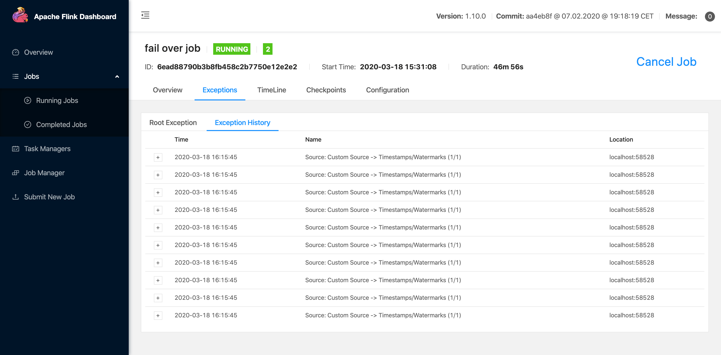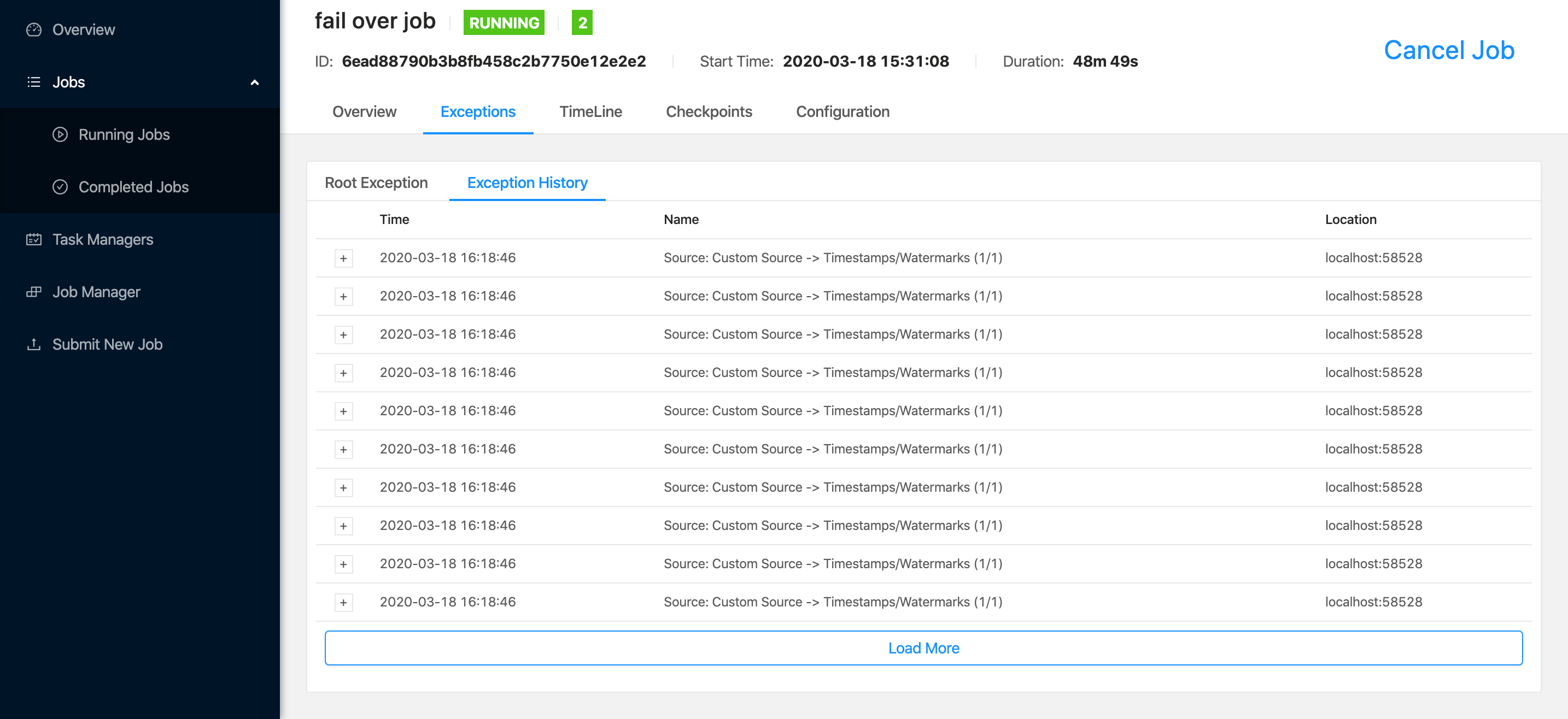 vthinkxie opened a new pull request #11436: [FLINK-11404][web] add load more feature in exception page URL: https://github.com/apache/flink/pull/11436 ## What is the purpose of the change ref https://issues.apache.org/jira/browse/FLINK-11404 ## Brief change log support more metric display at once ## Verifying this change - *Submit a failover job* - *Go to the exception (more than 10 exceptions)* - *check if the load more button works* before:  after:  ## Does this pull request potentially affect one of the following parts: - Dependencies (does it add or upgrade a dependency): (no) - The public API, i.e., is any changed class annotated with `@Public(Evolving)`: (no) - The serializers: (no) - The runtime per-record code paths (performance sensitive): (no) - Anything that affects deployment or recovery: JobManager (and its components), Checkpointing, Yarn/Mesos, ZooKeeper: (no) - The S3 file system connector: (no) ## Documentation - Does this pull request introduce a new feature? (no) - If yes, how is the feature documented? (not documented)