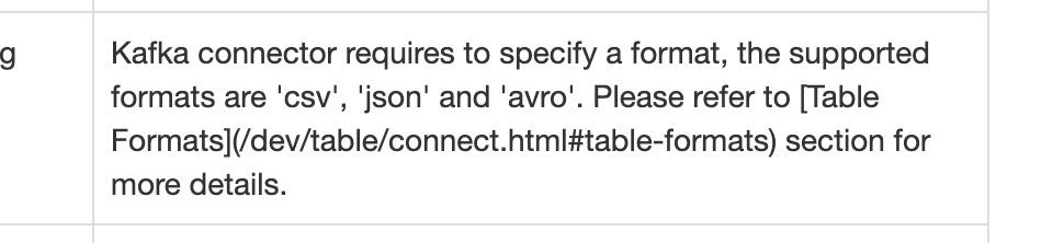 ########## File path: docs/dev/table/connectors/kafka.md ########## @@ -0,0 +1,213 @@ +--- +title: "Apache Kafka SQL Connector" +nav-title: Kafka +nav-parent_id: sql-connectors +nav-pos: 1 +--- +<!-- +Licensed to the Apache Software Foundation (ASF) under one +or more contributor license agreements. See the NOTICE file +distributed with this work for additional information +regarding copyright ownership. The ASF licenses this file +to you under the Apache License, Version 2.0 (the +"License"); you may not use this file except in compliance +with the License. You may obtain a copy of the License at + + http://www.apache.org/licenses/LICENSE-2.0 + +Unless required by applicable law or agreed to in writing, +software distributed under the License is distributed on an +"AS IS" BASIS, WITHOUT WARRANTIES OR CONDITIONS OF ANY +KIND, either express or implied. See the License for the +specific language governing permissions and limitations +under the License. +--> + +<span class="label label-primary">Scan Source: Unbounded</span> +<span class="label label-primary">Sink: Streaming Append Mode</span> + +* This will be replaced by the TOC +{:toc} + +Flink provides an [Apache Kafka](https://kafka.apache.org) connector for reading data from and writing data to Kafka topics. + +Dependencies +------------ + +Apache Flink ships with multiple Kafka connectors: universal, 0.10, and 0.11. +This universal Kafka connector attempts to track the latest version of the Kafka client. +The version of the client it uses may change between Flink releases. +Modern Kafka clients are backwards compatible with broker versions 0.10.0 or later. +For most users the universal Kafka connector is the most appropriate. +However, for Kafka versions 0.11.x and 0.10.x, we recommend using the dedicated ``0.11`` and ``0.10`` connectors, respectively. +For details on Kafka compatibility, please refer to the official [Kafka documentation](https://kafka.apache.org/protocol.html#protocol_compatibility). + +| Kafka Version | Maven dependency | SQL Client JAR | +| :------------------ | :-------------------------------------------------------- | :----------------------| +| universal | `flink-connector-kafka{{site.scala_version_suffix}}` | {% if site.is_stable %} [Download](https://repo.maven.apache.org/maven2/org/apache/flink/flink-connector-kafka{{site.scala_version_suffix}}/{{site.version}}/flink-connector-kafka{{site.scala_version_suffix}}-{{site.version}}.jar) {% endif %} | +| 0.11.x | `flink-connector-kafka-011{{site.scala_version_suffix}}` | {% if site.is_stable %} [Download](https://repo.maven.apache.org/maven2/org/apache/flink/flink-connector-kafka-011{{site.scala_version_suffix}}/{{site.version}}/flink-connector-kafka{{site.scala_version_suffix}}-{{site.version}}.jar) {% endif %} | +| 0.10.x | `flink-connector-kafka-010{{site.scala_version_suffix}}` | {% if site.is_stable %} [Download](https://repo.maven.apache.org/maven2/org/apache/flink/flink-connector-kafka-010{{site.scala_version_suffix}}/{{site.version}}/flink-connector-kafka{{site.scala_version_suffix}}-{{site.version}}.jar) {% endif %} | + +<span class="label label-danger">Attention</span> The Kafka SQL sink does not support exactly-once writes to Kafka. + +The dependency downloading links is only available for stable releases. Review comment: Add "Only available for stable releases" into the above table? Currently, the "SQL Client JAR" column is blank. ########## File path: docs/dev/table/connectors/kafka.md ########## @@ -0,0 +1,213 @@ +--- +title: "Apache Kafka SQL Connector" +nav-title: Kafka +nav-parent_id: sql-connectors +nav-pos: 1 +--- +<!-- +Licensed to the Apache Software Foundation (ASF) under one +or more contributor license agreements. See the NOTICE file +distributed with this work for additional information +regarding copyright ownership. The ASF licenses this file +to you under the Apache License, Version 2.0 (the +"License"); you may not use this file except in compliance +with the License. You may obtain a copy of the License at + + http://www.apache.org/licenses/LICENSE-2.0 + +Unless required by applicable law or agreed to in writing, +software distributed under the License is distributed on an +"AS IS" BASIS, WITHOUT WARRANTIES OR CONDITIONS OF ANY +KIND, either express or implied. See the License for the +specific language governing permissions and limitations +under the License. +--> + +<span class="label label-primary">Scan Source: Unbounded</span> +<span class="label label-primary">Sink: Streaming Append Mode</span> + +* This will be replaced by the TOC +{:toc} + +Flink provides an [Apache Kafka](https://kafka.apache.org) connector for reading data from and writing data to Kafka topics. + +Dependencies +------------ + +Apache Flink ships with multiple Kafka connectors: universal, 0.10, and 0.11. +This universal Kafka connector attempts to track the latest version of the Kafka client. +The version of the client it uses may change between Flink releases. +Modern Kafka clients are backwards compatible with broker versions 0.10.0 or later. +For most users the universal Kafka connector is the most appropriate. +However, for Kafka versions 0.11.x and 0.10.x, we recommend using the dedicated ``0.11`` and ``0.10`` connectors, respectively. +For details on Kafka compatibility, please refer to the official [Kafka documentation](https://kafka.apache.org/protocol.html#protocol_compatibility). + +| Kafka Version | Maven dependency | SQL Client JAR | +| :------------------ | :-------------------------------------------------------- | :----------------------| +| universal | `flink-connector-kafka{{site.scala_version_suffix}}` | {% if site.is_stable %} [Download](https://repo.maven.apache.org/maven2/org/apache/flink/flink-connector-kafka{{site.scala_version_suffix}}/{{site.version}}/flink-connector-kafka{{site.scala_version_suffix}}-{{site.version}}.jar) {% endif %} | +| 0.11.x | `flink-connector-kafka-011{{site.scala_version_suffix}}` | {% if site.is_stable %} [Do