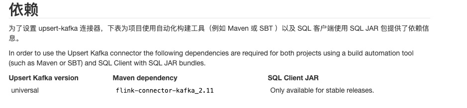 +为了设置 upsert-kafka 连接器,下表为项目使用自动化构建工具(例如 Maven 或 SBT )以及 SQL 客户端使用 SQL JAR