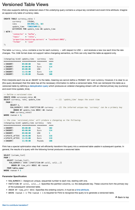@alpinegizmo thank you for your patience I've updated the versioned view section.  I also moved temporal table functions to a new "legacy" page and rewrote the example.  ---------------------------------------------------------------- This is an automated message from the Apache Git Service. To respond to the message, please log on to GitHub and use the URL above to go to the specific comment. For queries about this service, please contact Infrastructure at: [email protected]