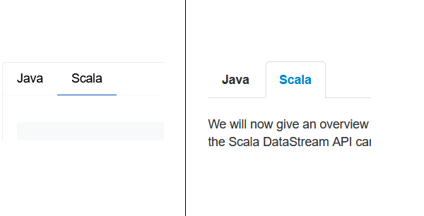I think the code tabs have lost a bit of clarity; it's not immediately obvious that you can click them in the first place.  In a similar vein, the REST API request/response drop-down elements are also not rendered in a way that indicates them to be interactive. The previous approach was admittedly crude. A down-arrow after the text would likely do the trick already. This will remove some excessive whitespace, and ensure that the url font size isn't smaller than usual text: ``` .rest-api h5 { margin-top: .5em; margin-bottom: .5em; font-size: 1em; } ``` ---------------------------------------------------------------- This is an automated message from the Apache Git Service. To respond to the message, please log on to GitHub and use the URL above to go to the specific comment. For queries about this service, please contact Infrastructure at: [email protected]