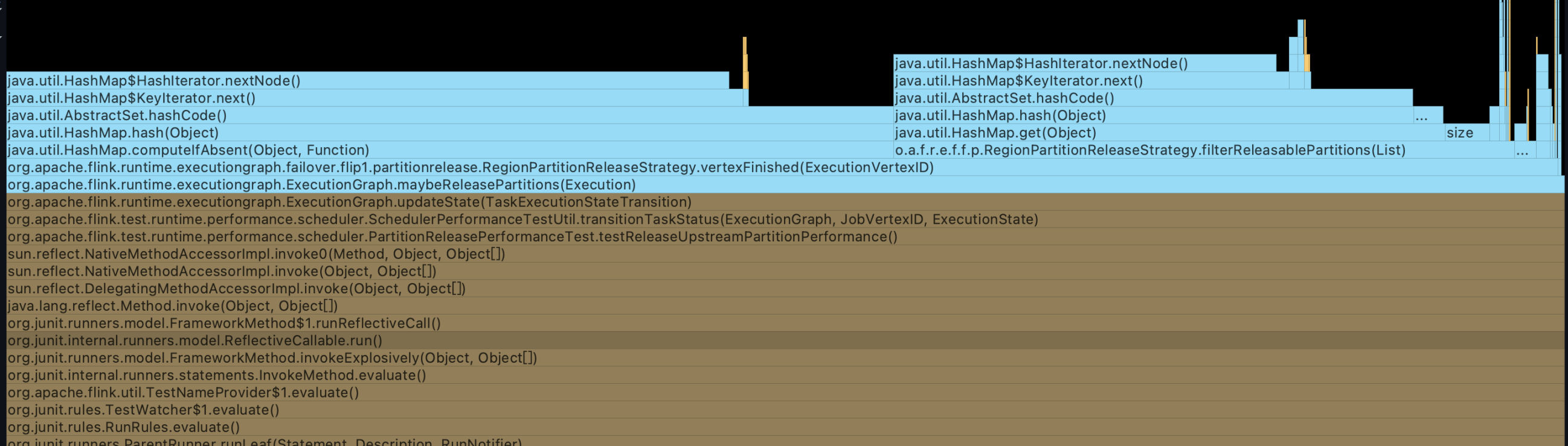 It's worth noting that although after the optimization the complexity is O(N^2), the time cost on RegionPartitionReleaseStrategy#filterReleasablePartitions is still a bit long. As illustrated in the figure below, we can see that most of time is spent on `HashMap.get`.  -- This is an automated message from the Apache Git Service. To respond to the message, please log on to GitHub and use the URL above to go to the specific comment. For queries about this service, please contact Infrastructure at: [email protected]