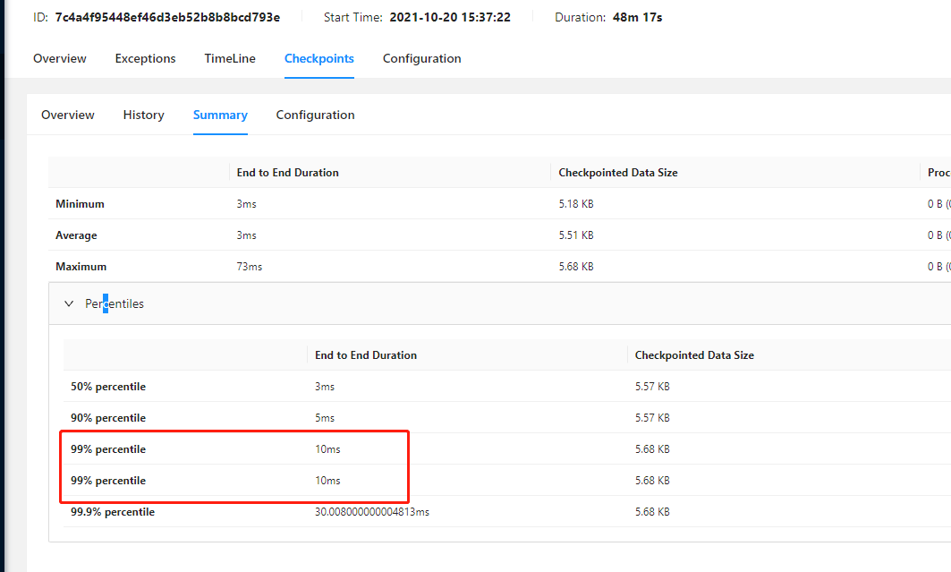 fix the problem that job checkpoint page has two p99 which is duplicated ## What is the purpose of the change job checkpoint pag have two p99 costtime  ## Brief change log - *fix checkpoint summary page Percentiles have two p99 item* ## Verifying this change This change is a trivial rework / code cleanup without any test coverage. ## Does this pull request potentially affect one of the following parts: - Dependencies (does it add or upgrade a dependency): no - The public API, i.e., is any changed class annotated with `@Public(Evolving)`: no - The serializers: no - The runtime per-record code paths (performance sensitive): no - Anything that affects deployment or recovery: JobManager (and its components), Checkpointing, Kubernetes/Yarn, ZooKeeper: no - The S3 file system connector: no ## Documentation - Does this pull request introduce a new feature? no -- This is an automated message from the Apache Git Service. To respond to the message, please log on to GitHub and use the URL above to go to the specific comment. To unsubscribe, e-mail: [email protected] For queries about this service, please contact Infrastructure at: [email protected]