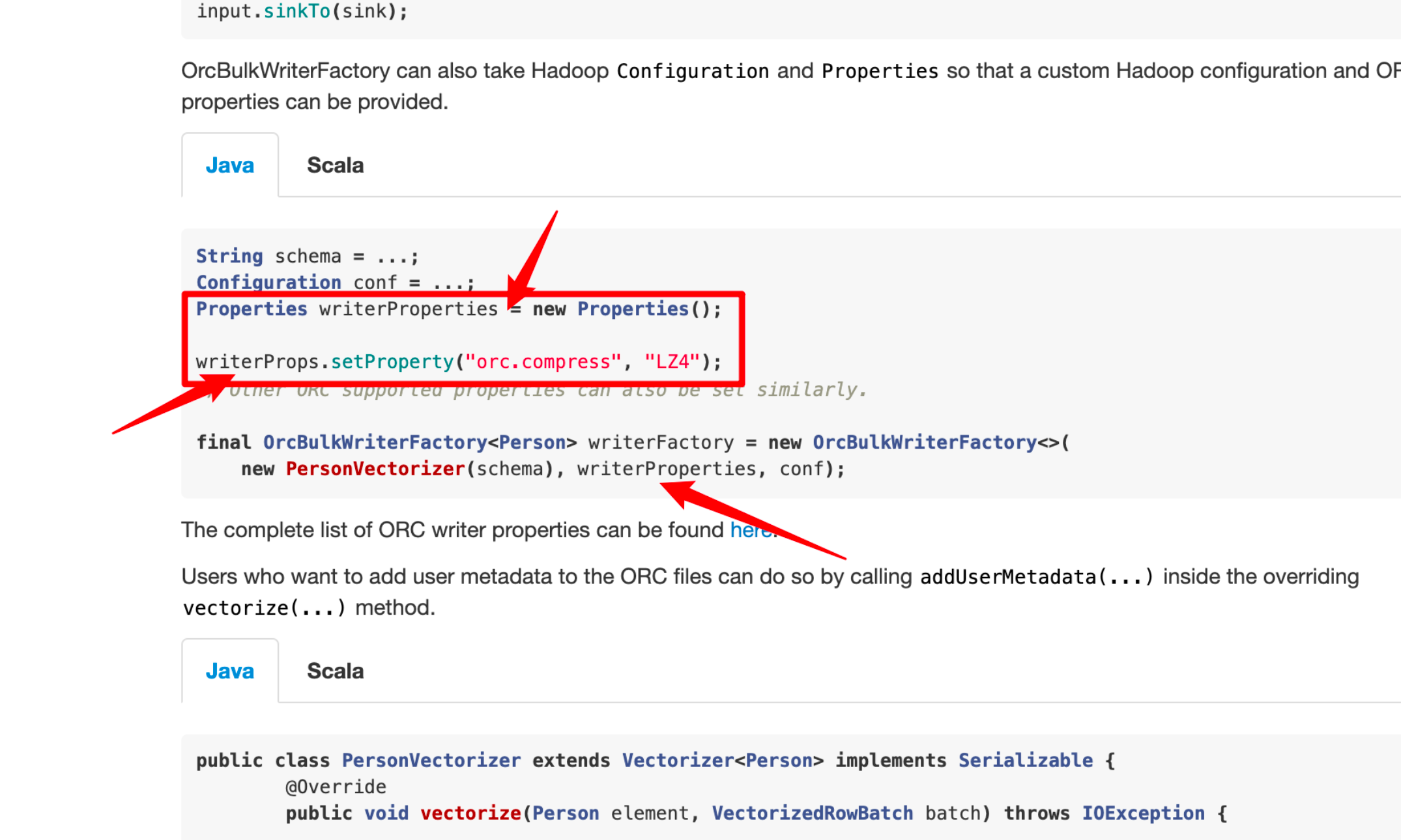 ## What is the purpose of the change #### Problem Description - What should be quoted here is writerProperties Shouldn't be is writerProps - I checked all versions and found that 1.11 version and above need to be modified here - Please use cherry-pick to fix all branches involved in the problem (1.11 + and Chinese documents )  - [Official website document FileSink orc compression attribute reference error --- issue](https://issues.apache.org/jira/projects/FLINK/issues/FLINK-25091?filter=reportedbyme) -- This is an automated message from the Apache Git Service. To respond to the message, please log on to GitHub and use the URL above to go to the specific comment. To unsubscribe, e-mail: [email protected] For queries about this service, please contact Infrastructure at: [email protected]