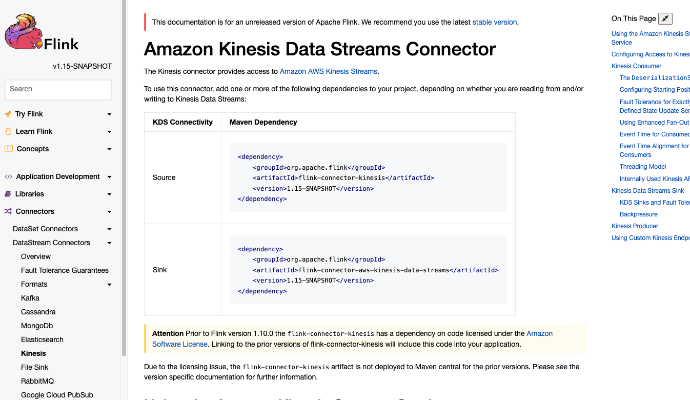 ########## File path: docs/content/docs/connectors/datastream/kinesis.md ########## @@ -29,9 +29,26 @@ under the License. The Kinesis connector provides access to [Amazon AWS Kinesis Streams](http://aws.amazon.com/kinesis/streams/). -To use the connector, add the following Maven dependency to your project: - -{{< artifact flink-connector-kinesis >}} +To use this connector, add one or more of the following dependencies to your project, depending on whether you are reading from and/or writing to Kinesis Data Streams: + +<table class="table table-bordered"> Review comment: Looks okay :-)  -- This is an automated message from the Apache Git Service. To respond to the message, please log on to GitHub and use the URL above to go to the specific comment. To unsubscribe, e-mail: [email protected] For queries about this service, please contact Infrastructure at: [email protected]