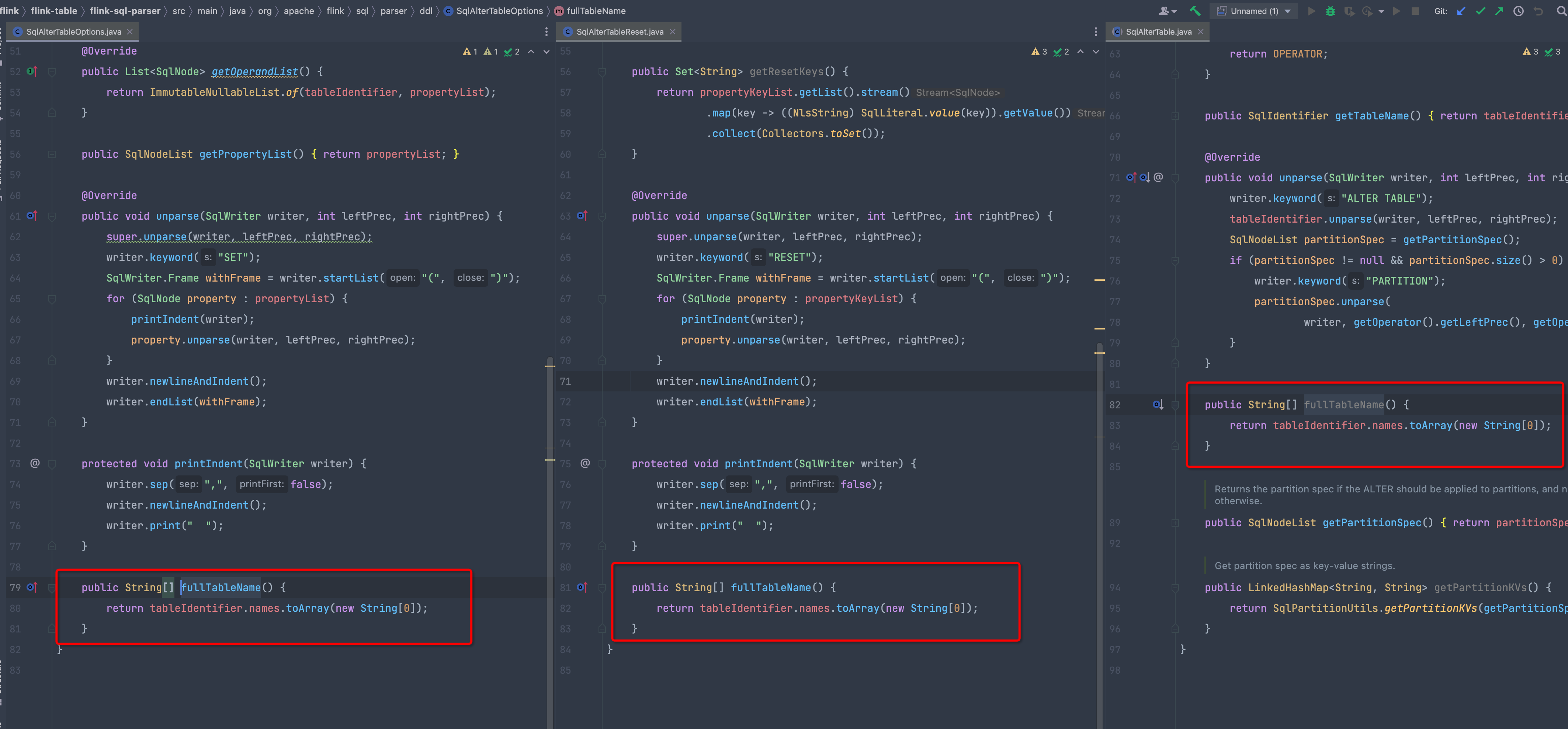 SqlAlterTableOptions and SqlAlterTableReset override the fullTableName()