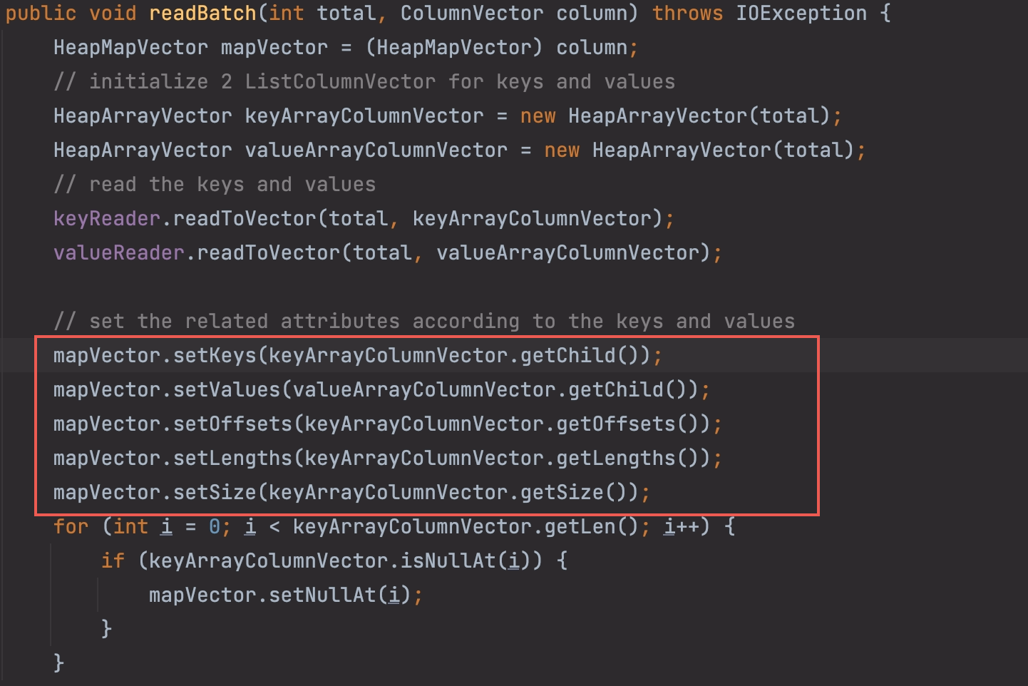 `MapColumnReader` actually readToVector by creating 2 new ArrayColumnReader