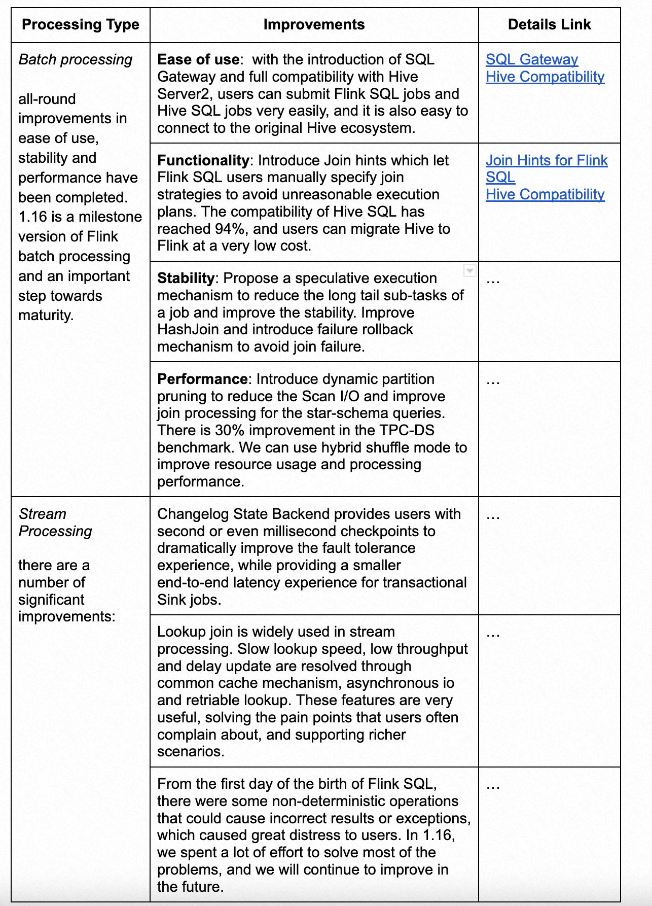 ########## _posts/2022-10-10-1.16-announcement.md: ########## @@ -0,0 +1,401 @@ +--- +layout: post +title: "Announcing the Release of Apache Flink 1.16" +subtitle: "" +date: 2022-10-10T08:00:00.000Z +categories: news +authors: +- godfreyhe: + name: "Godfrey He" + twitter: "godfreyhe" + +--- + +Apache Flink continues to grow at a rapid pace and is one of the most active +communities in Apache. Flink 1.16 had over 230 contributors enthusiastically participating, +with 19 FLIPs and 900+ issues completed, bringing a lot of exciting features to the community. + +Flink has become the leading role and factual standard of stream processing, +and the concept of the unification of stream (aka unbounded) and batch (aka bounded) data +processing is gradually gaining recognition and is being successfully implemented in more +and more companies. Previously, the integrated stream and batch concept placed more emphasis +on a unified API and a unified computing framework. This year, based on this, Flink proposed +the next development direction of [Flink-Streaming Warehouse](https://www.alibabacloud.com/blog/more-than-computing-a-new-era-led-by-the-warehouse-architecture-of-apache-flink_598821) (Streamhouse), +which further upgraded the scope of stream-batch integration: it truly completes not only +the unified computation but also unified storage, thus realizing unified real-time analysis. + Review Comment: do you want the following table ?  -- This is an automated message from the Apache Git Service. To respond to the message, please log on to GitHub and use the URL above to go to the specific comment. To unsubscribe, e-mail: [email protected] For queries about this service, please contact Infrastructure at: [email protected]