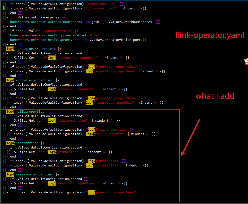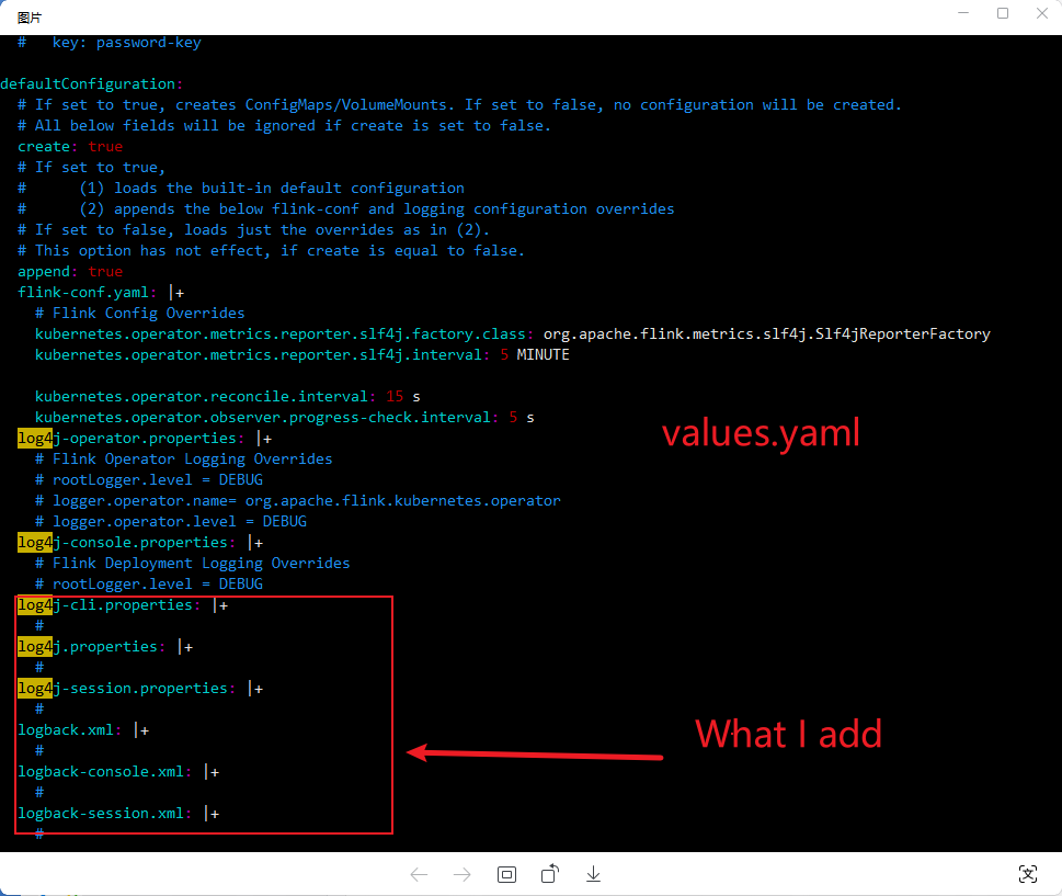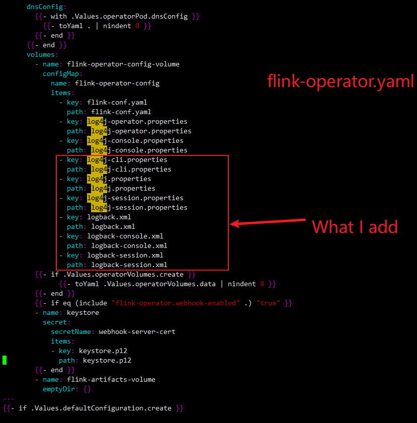 > Hi,everyone,could I ask a question? If i want to add some log's file into FlinkDepoyment's /opt/flink/conf, how should I do.I found even though I change helm's config,it will only add into operator's /opt/flink/conf , not FlinkDepoyment's /opt/flink/conf,and my flink-kubernetes-operator version is 1.5.These is some pictures.       -- This is an automated message from the Apache Git Service. To respond to the message, please log on to GitHub and use the URL above to go to the specific comment. To unsubscribe, e-mail: [email protected] For queries about this service, please contact Infrastructure at: [email protected]