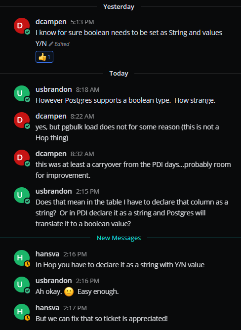 ### Apache Hop version? 2.3 ### Java version? 11 ### Operating system Windows ### What happened? Import: https://issues.apache.org/jira/browse/HOP-4605 From talking with people on Hop's Mattermost chat, the Postgres Bulkloader needs the users to take their existing boolean columns and cast them into strings with Y/N values when outputting to a destination table with a boolean column within Postgress. If that is true, a good improvement would be to transparently convert those for users in the bulk loader step which would avoid extra Select Transforms on canvas or other acrobatics from them in the stream.  ### Issue Priority Priority: 3 ### Issue Component Component: Transforms -- This is an automated message from the Apache Git Service. To respond to the message, please log on to GitHub and use the URL above to go to the specific comment. To unsubscribe, e-mail: [email protected] For queries about this service, please contact Infrastructure at: [email protected]