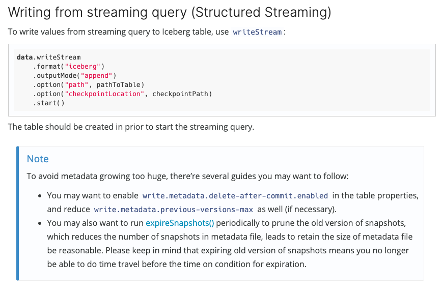 This patch adds the guide about using structured streaming sink for Iceberg, which is not documented yet. The usage itself is pretty simple, but there're some points end users would like to know in prior to write the table with streaming query, so the patch also adds some known guides on maintaining the table. Snapshot follows (this will be added before `inspecting table`):  ---------------------------------------------------------------- This is an automated message from the Apache Git Service. To respond to the message, please log on to GitHub and use the URL above to go to the specific comment. For queries about this service, please contact Infrastructure at: [email protected] --------------------------------------------------------------------- To unsubscribe, e-mail: [email protected] For additional commands, e-mail: [email protected]