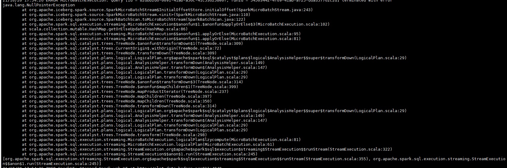 When I read iceberg table using Spark Structured Streaming, I got a NPE error. The reason is the iceberg table has been execute expire snapshot before I read it. In this case, the method oldestSnapshot in SnapshotUtil can not work, and return null snapshot. So the SparkMicroBatchStream.initialOffset() will throw NPE.  -- This is an automated message from the Apache Git Service. To respond to the message, please log on to GitHub and use the URL above to go to the specific comment. To unsubscribe, e-mail: [email protected] For queries about this service, please contact Infrastructure at: [email protected] --------------------------------------------------------------------- To unsubscribe, e-mail: [email protected] For additional commands, e-mail: [email protected]
