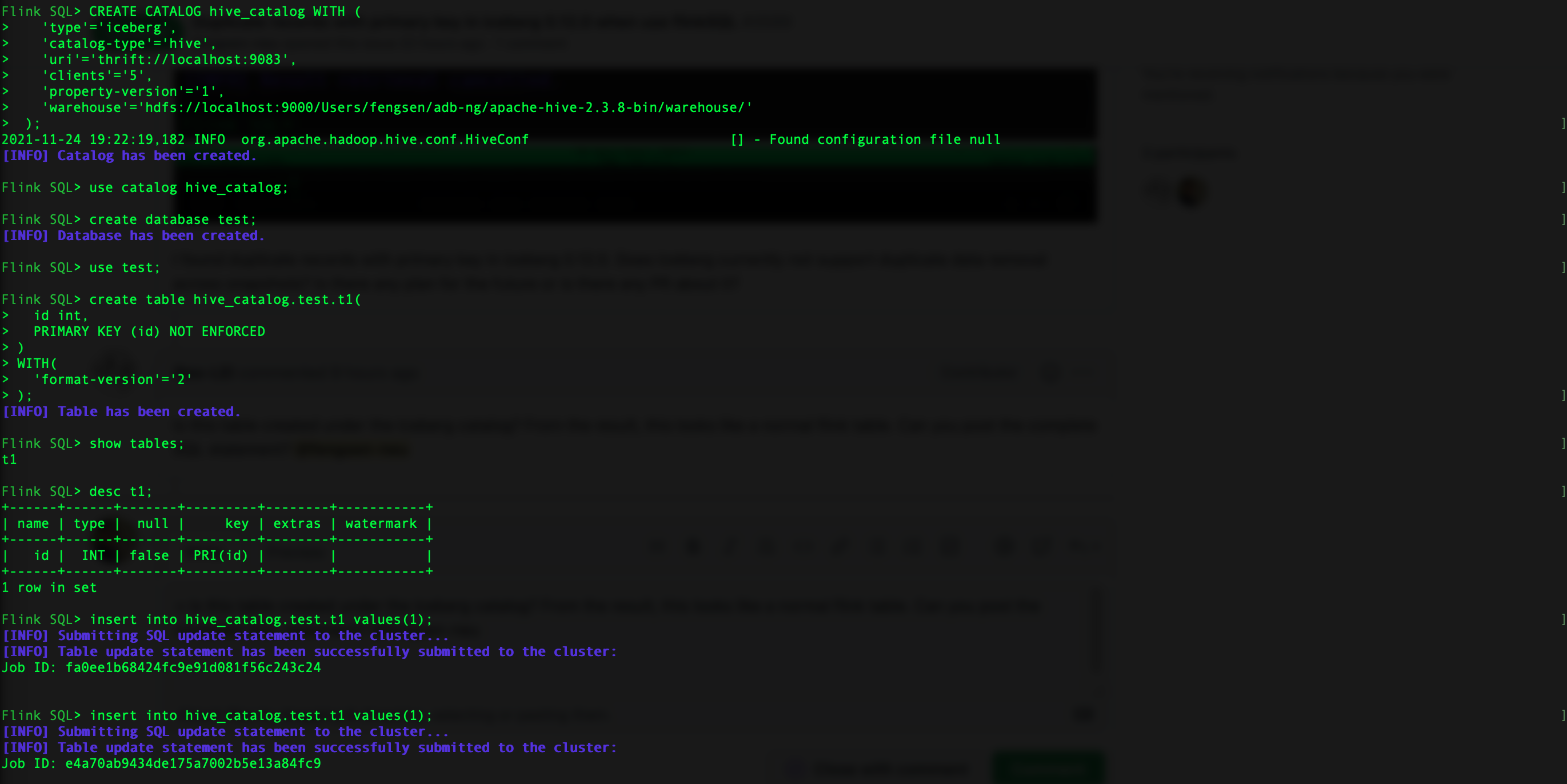 > Is this table created under the Iceberg catalog? From the result, this looks like a normal flink table. Can you post the complete SQL statement? @fengsen-neu   -- This is an automated message from the Apache Git Service. To respond to the message, please log on to GitHub and use the URL above to go to the specific comment. To unsubscribe, e-mail: [email protected] For queries about this service, please contact Infrastructure at: [email protected] --------------------------------------------------------------------- To unsubscribe, e-mail: [email protected] For additional commands, e-mail: [email protected]