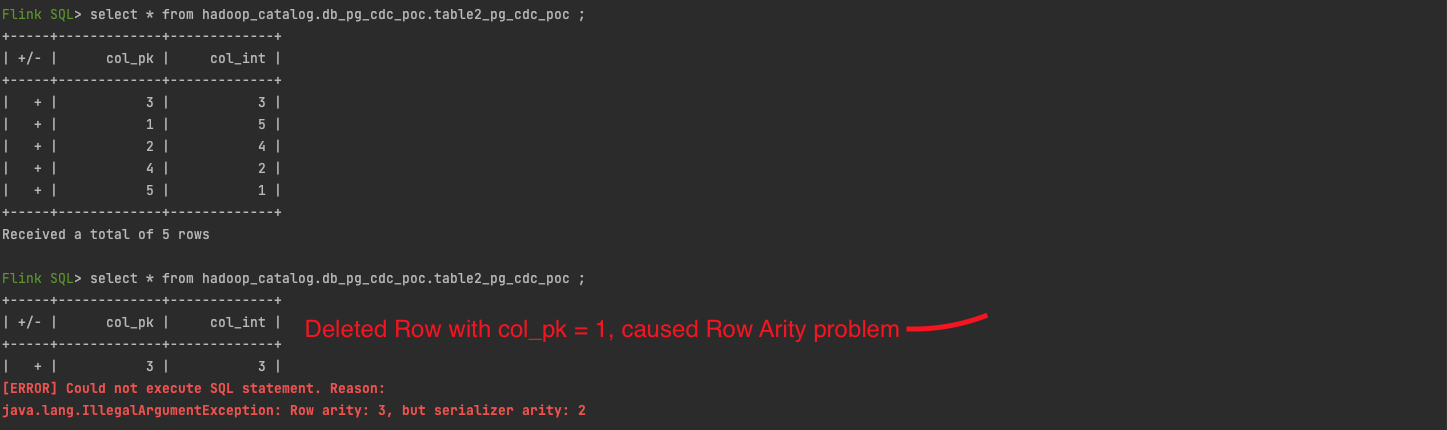 # Background I am running Iceberg 0.12.1 (with iceberg table V2) with Flink 1.12.1 I have a Flink-connector-cdc hooked up to a postgres table. This CDC detects changes and pushes them to the sink which is a Hadoop Iceberg table. When I insert new rows to postgres, they propagate correctly to Iceberg. When I try to execute row-level deletes on those newly inserted rows, it propagates correctly. When I try to execute row-level deletes near the bottom-most rows of the table, it propagates correctly. # PROBLEM: However, when I try to delete rows from the top of the table such as at row indices 1 & 2, I get an exception java.lang.IllegalArgumentException: Row arity: 3, but serializer arity: 2. (refer to attached screenshot below)  ## Question I know this was an issue in previous versions of iceberg when someone tries to insert/delete rows. However the problem I’m having is when I am trying to delete rows from the very top rows of the table, only then I get the Row Arity Exception. Is this a known issue or is there a reason why the Iceberg tables are unable to process deletes on earlier(top rows, ie; row 1 2 3, …) rows? My iceberg table format is set to 2. -- This is an automated message from the Apache Git Service. To respond to the message, please log on to GitHub and use the URL above to go to the specific comment. To unsubscribe, e-mail: [email protected] For queries about this service, please contact Infrastructure at: [email protected] --------------------------------------------------------------------- To unsubscribe, e-mail: [email protected] For additional commands, e-mail: [email protected]