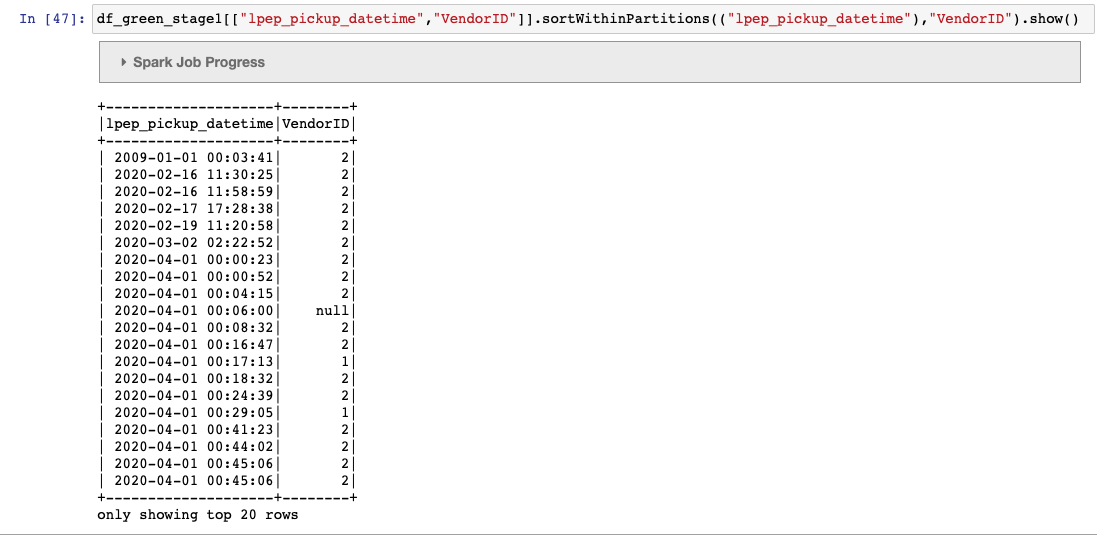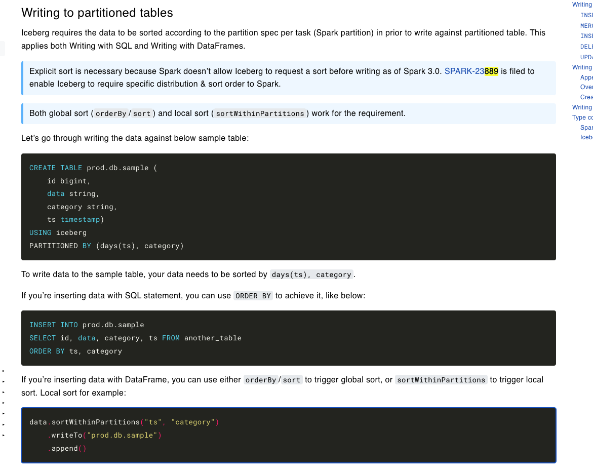 I tried replicating the dual partition example provided in the docs https://iceberg.apache.org/docs/latest/spark-writes/  Created the below table: ------- "CREATE TABLE nyc.green_taxis_by_days_vendorid ( VendorID string, lpep_pickup_datetime timestamp, lpep_dropoff_datetime string, store_and_fwd_flag string,RatecodeID string,PULocationID string,DOLocationID string, passenger_count string,trip_distance string,fare_amount string,extra string,mta_tax string, tip_amount string,tolls_amount string,ehail_fee string,improvement_surcharge string, total_amount string, payment_type string,trip_type string, congestion_surcharge string) USING iceberg PARTITIONED BY ( ***days(lpep_pickup_datetime),VendorID*** )" ----- Trying to write into the table via both dataframe api and pyspark sql...and get the same error (i.e. file already closed) df_green_stage1.sortWithinPartitions(("lpep_pickup_datetime"),"VendorID") \ .writeTo("nyc.green_taxis_by_days_vendorid") \ .append() ----- %%sql INSERT INTO nyc.green_taxis_by_days_vendorid ( SELECT VendorID,lpep_pickup_datetime,lpep_dropoff_datetime,store_and_fwd_flag,RatecodeID,PULocationID,DOLocationID,passenger_count,trip_distance,fare_amount, extra,mta_tax,tip_amount,tolls_amount,ehail_fee, improvement_surcharge,total_amount,payment_type,trip_type,congestion_surcharge FROM nyc.green_taxis_by_days_vendorid_withdate ORDER BY lpep_pickup_datetime,VendorID ) ------ However, I run into the below error The partitions are defined as days(timestamp) and secondary as vendor id. since the dataframe is sorted by "timestamp, vendor id" and not as "days(timestamp), vendor id" as defined in the iceberg table , we get the file already closed error.  Is this a bug ? any work arounds (other than adding an additional date column and using that in the sort) ? -------- An error was encountered: An error occurred while calling o294.append. : org.apache.spark.SparkException: Writing job aborted. at org.apache.spark.sql.execution.datasources.v2.V2TableWriteExec.writeWithV2(WriteToDataSourceV2Exec.scala:388) at org.apache.spark.sql.execution.datasources.v2.V2TableWriteExec.writeWithV2$(WriteToDataSourceV2Exec.scala:336) at org.apache.spark.sql.execution.datasources.v2.AppendDataExec.writeWithV2(WriteToDataSourceV2Exec.scala:218) at org.apache.spark.sql.execution.datasources.v2.AppendDataExec.run(WriteToDataSourceV2Exec.scala:225) at org.apache.spark.sql.execution.datasources.v2.V2CommandExec.result$lzycompute(V2CommandExec.scala:40) at org.apache.spark.sql.execution.datasources.v2.V2CommandExec.result(V2CommandExec.scala:40) at org.apache.spark.sql.execution.datasources.v2.V2CommandExec.doExecute(V2CommandExec.scala:55) at org.apache.spark.sql.execution.SparkPlan.$anonfun$execute$1(SparkPlan.scala:194) at org.apache.spark.sql.execution.SparkPlan.$anonfun$executeQuery$1(SparkPlan.scala:232) at org.apache.spark.rdd.RDDOperationScope$.withScope(RDDOperationScope.scala:151) at org.apache.spark.sql.execution.SparkPlan.executeQuery(SparkPlan.scala:229) at org.apache.spark.sql.execution.SparkPlan.execute(SparkPlan.scala:190) at org.apache.spark.sql.execution.QueryExecution.toRdd$lzycompute(QueryExecution.scala:134) at org.apache.spark.sql.execution.QueryExecution.toRdd(QueryExecution.scala:133) at org.apache.spark.sql.DataFrameWriterV2.$anonfun$runCommand$1(DataFrameWriterV2.scala:196) at org.apache.spark.sql.catalyst.QueryPlanningTracker$.withTracker(QueryPlanningTracker.scala:107) at org.apache.spark.sql.execution.SQLExecution$.withTracker(SQLExecution.scala:232) at org.apache.spark.sql.execution.SQLExecution$.executeQuery$1(SQLExecution.scala:110) at org.apache.spark.sql.execution.SQLExecution$.$anonfun$withNewExecutionId$6(SQLExecution.scala:135) at org.apache.spark.sql.catalyst.QueryPlanningTracker$.withTracker(QueryPlanningTracker.scala:107) at org.apache.spark.sql.execution.SQLExecution$.withTracker(SQLExecution.scala:232) at org.apache.spark.sql.execution.SQLExecution$.$anonfun$withNewExecutionId$5(SQLExecution.scala:135) at org.apache.spark.sql.execution.SQLExecution$.withSQLConfPropagated(SQLExecution.scala:253) at org.apache.spark.sql.execution.SQLExecution$.$anonfun$withNewExecutionId$1(SQLExecution.scala:134) at org.apache.spark.sql.SparkSession.withActive(SparkSession.scala:775) at org.apache.spark.sql.execution.SQLExecution$.withNewExecutionId(SQLExecution.scala:68) at org.apache.spark.sql.DataFrameWriterV2.runCommand(DataFrameWriterV2.scala:196) at org.apache.spark.sql.DataFrameWriterV2.append(DataFrameWriterV2.scala:149) at sun.reflect.NativeMethodAccessorImpl.invoke0(Native Method) at sun.reflect.NativeMethodAccessorImpl.invoke(NativeMethodAccessorImpl.java:62) at sun.reflect.DelegatingMethodAccessorImpl.invoke(DelegatingMethodAccessorImpl.java:43) at java.lang.reflect.Method.invoke(Method.java:498) at py4j.reflection.MethodInvoker.invoke(MethodInvoker.java:244) at py4j.reflection.ReflectionEngine.invoke(ReflectionEngine.java:357) at py4j.Gateway.invoke(Gateway.java:282) at py4j.commands.AbstractCommand.invokeMethod(AbstractCommand.java:132) at py4j.commands.CallCommand.execute(CallCommand.java:79) at py4j.GatewayConnection.run(GatewayConnection.java:238) at java.lang.Thread.run(Thread.java:750) Caused by: org.apache.spark.SparkException: Job aborted due to stage failure: Task 0 in stage 32.0 failed 4 times, most recent failure: Lost task 0.3 in stage 32.0 (TID 103) (ip-172-31-21-243.ec2.internal executor 18): java.lang.IllegalStateException: Incoming records violate the writer assumption that records are clustered by spec and by partition within each spec. Either cluster the incoming records or switch to fanout writers. Encountered records that belong to already closed files: partition 'lpep_pickup_datetime_day=2020-04-01/VendorID=2' in spec [ 1000: lpep_pickup_datetime_day: day(2) 1001: VendorID: identity(1) ] at org.apache.iceberg.io.ClusteredWriter.write(ClusteredWriter.java:95) at org.apache.iceberg.io.ClusteredDataWriter.write(ClusteredDataWriter.java:34) at org.apache
