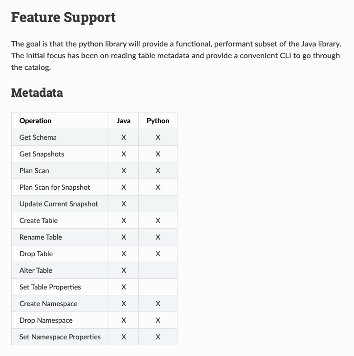 ########## python/mkdocs/docs/api.md: ########## @@ -307,15 +307,18 @@ scan = table.scan( The low level API `plan_files` methods returns a set of tasks that provide the files that might contain matching rows: ```json -['s3a://warehouse/wh/nyc/taxis/data/00003-4-42464649-92dd-41ad-b83b-dea1a2fe4b58-00001.parquet'] +[ + "s3a://warehouse/wh/nyc/taxis/data/00003-4-42464649-92dd-41ad-b83b-dea1a2fe4b58-00001.parquet" +] ``` In this case it is up to the engine itself to filter the file itself. Below, `to_arrow()` and `to_duckdb()` that already do this for you. ### Apache Arrow !!! note "Requirements" - This requires [PyArrow to be installed](index.md) + +This requires [PyArrow to be installed](index.md) Review Comment: This breaks the note unfortunately. ########## python/mkdocs/docs/feature-support.md: ########## @@ -21,21 +21,21 @@ The goal is that the python library will provide a functional, performant subset ## Metadata -| Operation | Java | Python | -|:-------------------------|:-----:|:------:| -| Get Schema | X | X | -| Get Snapshots | X | X | -| Plan Scan | X | X | -| Plan Scan for Snapshot | X | X | -| Update Current Snapshot | X | | -| Create Table | X | X | -| Rename Table | X | X | -| Drop Table | X | X | -| Alter Table | X | | -| Set Table Properties | X | | -| Create Namespace | X | X | -| Drop Namespace | X | X | -| Set Namespace Properties | X | X | +| Operation | Java | Python | Review Comment: I checked and this looks good:  -- This is an automated message from the Apache Git Service. To respond to the message, please log on to GitHub and use the URL above to go to the specific comment. To unsubscribe, e-mail: [email protected] For queries about this service, please contact Infrastructure at: [email protected] --------------------------------------------------------------------- To unsubscribe, e-mail: [email protected] For additional commands, e-mail: [email protected]