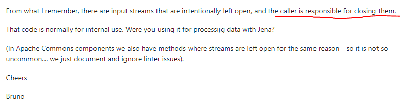 Hi @kinow Bruno,  Based on you last reply, are you saying if I do data processing with Jena, I should add some stream-closing mechanism myself in my code. If so, how should I do that? -- This is an automated message from the Apache Git Service. To respond to the message, please log on to GitHub and use the URL above to go to the specific comment. To unsubscribe, e-mail: [email protected] For queries about this service, please contact Infrastructure at: [email protected] --------------------------------------------------------------------- To unsubscribe, e-mail: [email protected] For additional commands, e-mail: [email protected]