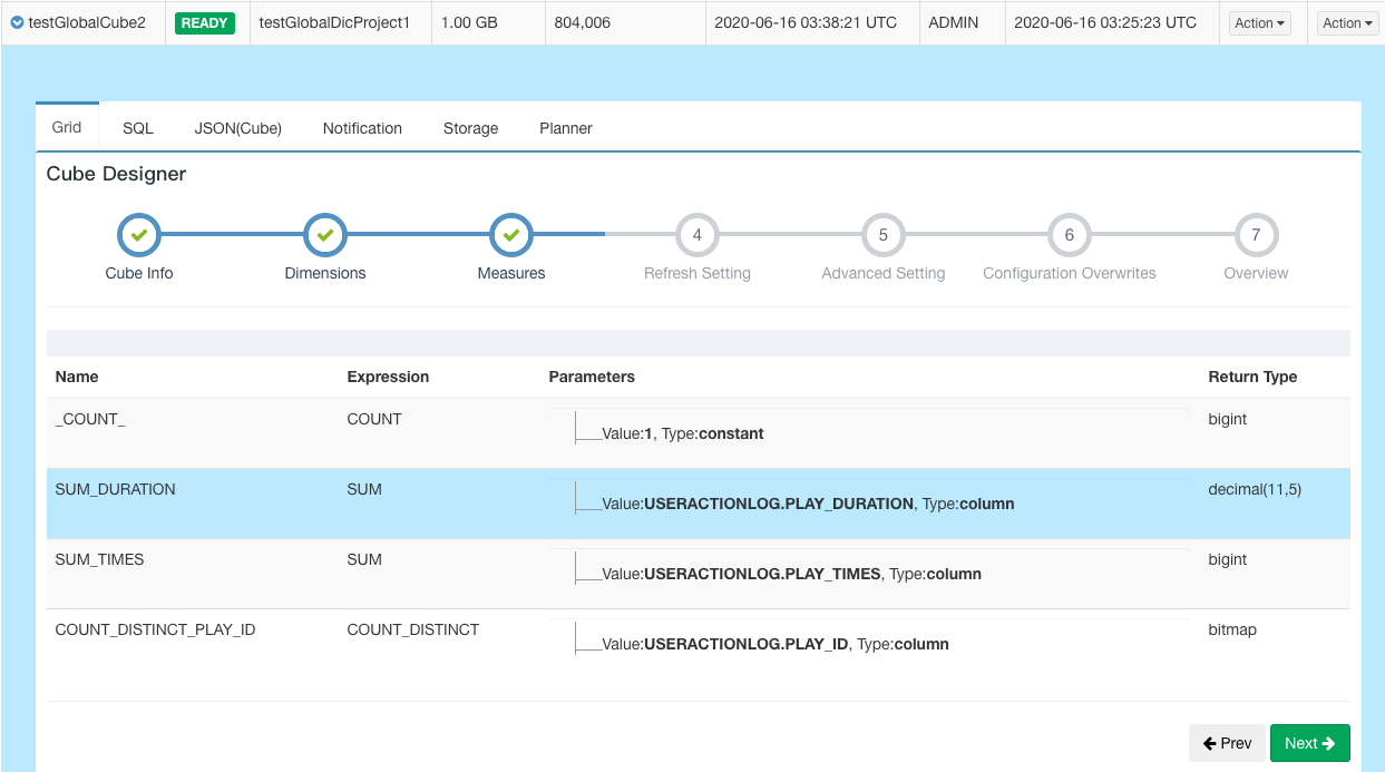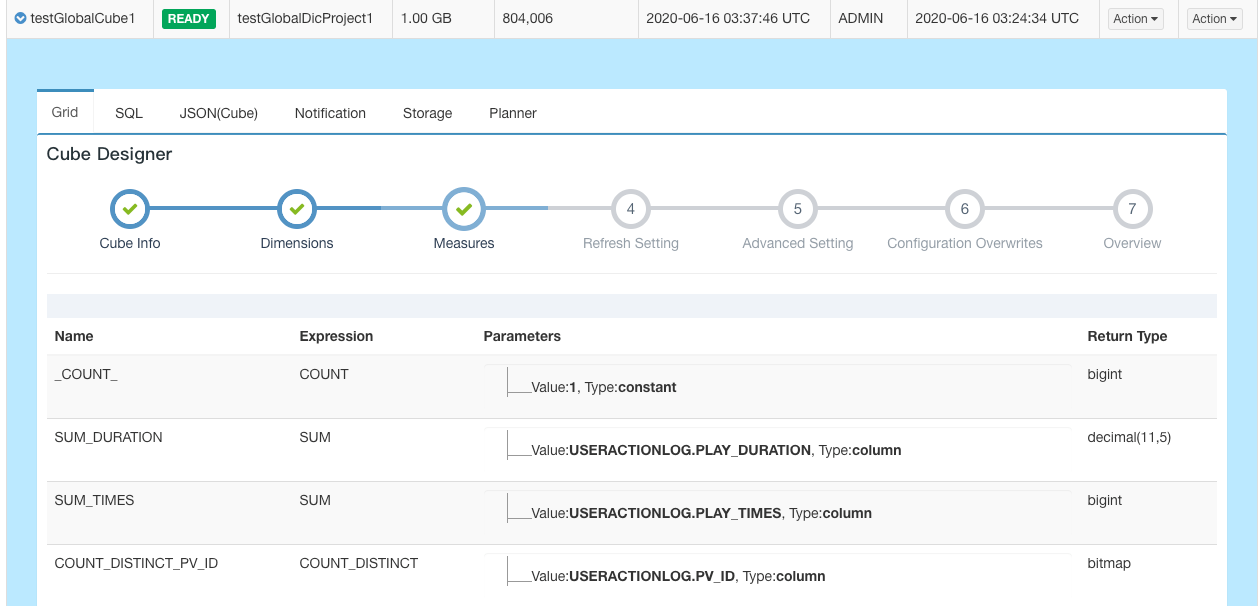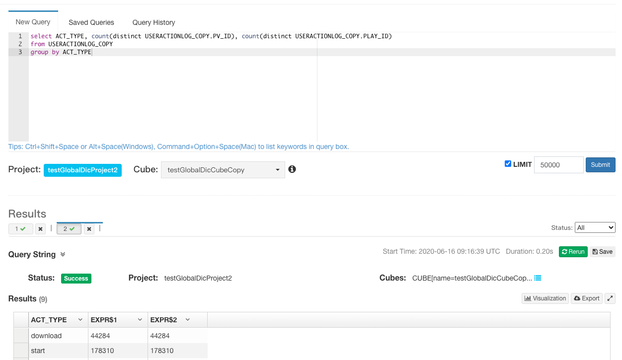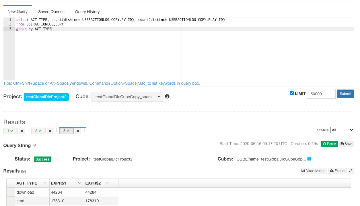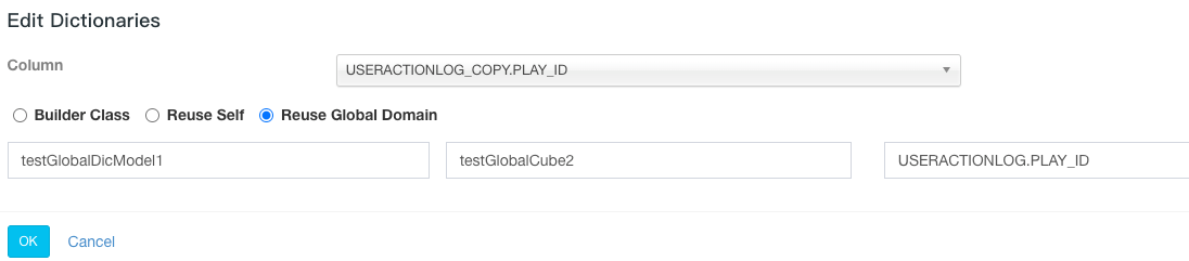 ### Test case - Create project named `testGlobalDicProject1`, from Hive load data source table`useractionLog` for this project  - Create one model `testGlobalDicModel1` and two cube `testGlobalCube1` and `testGlobalCube2` in project `testGlobalDicProject1`,  - add count distinct precisely measure for column `PV_ID` in `testGlobalCube1`  - add count distinct precisely measure for column `PLAY_ID` in `testGlobalCube2`  - Build two cube - Create another hive table `useractionLog_Copy` with the same data as `useractionLog` - Create project named `testGlobalDicProject2`, from Hive load data source table`useractionLog_Copy` for this project  - Create one cube `testGlobalCubeCopy` in project `testGlobalDicProject2`,  - add count distinct precisely measure for column `PV_ID` in `testGlobalCubeCopy`, and in `Advanced Dictionaries` choose `Reuse Global Domain`, set `Reuse Model Name` to `testGlobalDicModel1`, `Reuse Cube Name` to `testGlobalCube1`, `USERACTIONLOG.PV_ID` to `Reuse table.column`.  - add count distinct precisely measure for column `PLAY_ID` in `testGlobalCubeCopy`, and in `Advanced Dictionaries` choose `Reuse Global Domain`, set `Reuse Model Name` to `testGlobalDicModel1`, `Reuse Cube Name` to `testGlobalCube2`, `Reuse table.column` to `USERACTIONLOG.PLAY_ID`.  - Build cube `testGlobalCubeCopy` with MR engine, query this cube after build complete.  - Clone cube `testGlobalCubeCopy` and renamed to `testGlobalCubeCopy_spark`, modify Build engine to Spark and build, query this cube after build complete.  ---------------------------------------------------------------- This is an automated message from the Apache Git Service. To respond to the message, please log on to GitHub and use the URL above to go to the specific comment. For queries about this service, please contact Infrastructure at: [email protected]