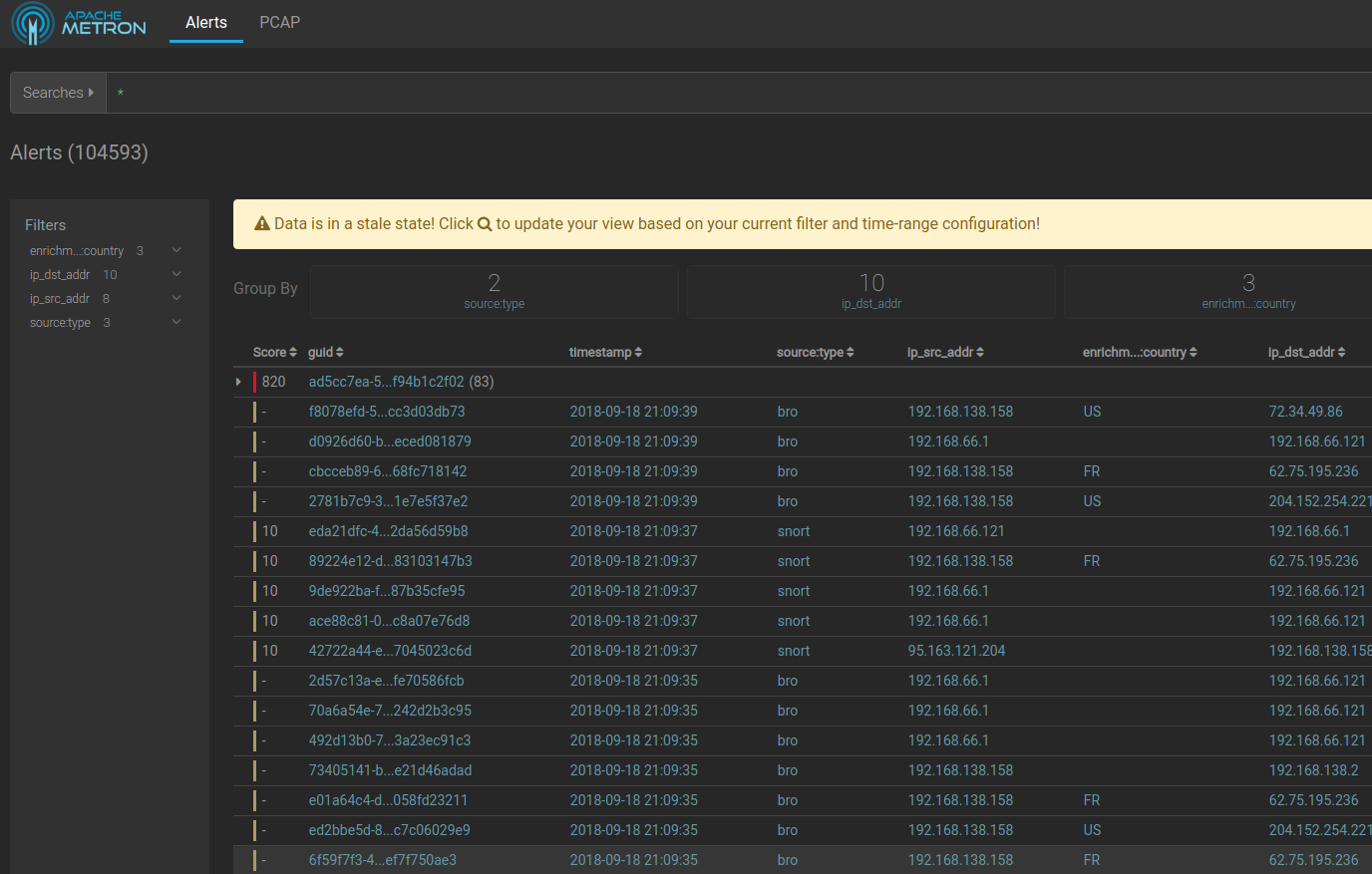 tiborm opened a new pull request #1478: METRON-2205: Introducing staleDataState on Alerts UI URL: https://github.com/apache/metron/pull/1478 ## Contributor Comments Currently, Alerts UI sends a query request to the REST API every time the user - add new filter - clear filters - change time range This behavior keeps the list of alerts and the state of the filtering in sync: every time the filter changes the visualized data change with it. The drawback of this behavior is it fires multiple query requests while the user tries to set up a more complex filter. The following scenario: 1. clearing the current filter 2. changing the time range 3. adding a filter for ip_src_addr 4. adding a filter for source:type 5. pressing the query button leads 5 queries instead of one. In the case of large data sets, this could lead to unnecessary load and UI glitches (results update the alerts table with partially filtered data). To fix this I ceased automatic querying on time-range or filter change and introduced staled data state. This means when the user making any changes in filtering compared to the previous result UI shows the following warning:  ## Testing Check out this branch and fire up the Alerts UI with the following script: /metron-interface/metron-alerts/scripts/start-dev.sh PR contains no backend changes so no rebuild of the full dev VM needed to test. ## Pull Request Checklist Thank you for submitting a contribution to Apache Metron. Please refer to our [Development Guidelines](https://cwiki.apache.org/confluence/pages/viewpage.action?pageId=61332235) for the complete guide to follow for contributions. Please refer also to our [Build Verification Guidelines](https://cwiki.apache.org/confluence/display/METRON/Verifying+Builds?show-miniview) for complete smoke testing guides. In order to streamline the review of the contribution we ask you follow these guidelines and ask you to double check the following: ### For all changes: - [x] Is there a JIRA ticket associated with this PR? If not one needs to be created at [Metron Jira](https://issues.apache.org/jira/browse/METRON/?selectedTab=com.atlassian.jira.jira-projects-plugin:summary-panel). - [x] Does your PR title start with METRON-XXXX where XXXX is the JIRA number you are trying to resolve? Pay particular attention to the hyphen "-" character. - [x] Has your PR been rebased against the latest commit within the target branch (typically master)? ### For code changes: - [x] Have you included steps to reproduce the behavior or problem that is being changed or addressed? - [x] Have you included steps or a guide to how the change may be verified and tested manually? - [x] Have you ensured that the full suite of tests and checks have been executed in the root metron folder via: ``` mvn -q clean integration-test install && dev-utilities/build-utils/verify_licenses.sh ``` - [x] Have you written or updated unit tests and or integration tests to verify your changes? - [x] If adding new dependencies to the code, are these dependencies licensed in a way that is compatible for inclusion under [ASF 2.0](http://www.apache.org/legal/resolved.html#category-a)? - [x] Have you verified the basic functionality of the build by building and running locally with Vagrant full-dev environment or the equivalent? ### For documentation related changes: - [x] Have you ensured that format looks appropriate for the output in which it is rendered by building and verifying the site-book? If not then run the following commands and the verify changes via `site-book/target/site/index.html`: ``` cd site-book mvn site ``` - [x] Have you ensured that any documentation diagrams have been updated, along with their source files, using [draw.io](https://www.draw.io/)? See [Metron Development Guidelines](https://cwiki.apache.org/confluence/display/METRON/Development+Guidelines) for instructions. #### Note: Please ensure that once the PR is submitted, you check travis-ci for build issues and submit an update to your PR as soon as possible. It is also recommended that [travis-ci](https://travis-ci.org) is set up for your personal repository such that your branches are built there before submitting a pull request.