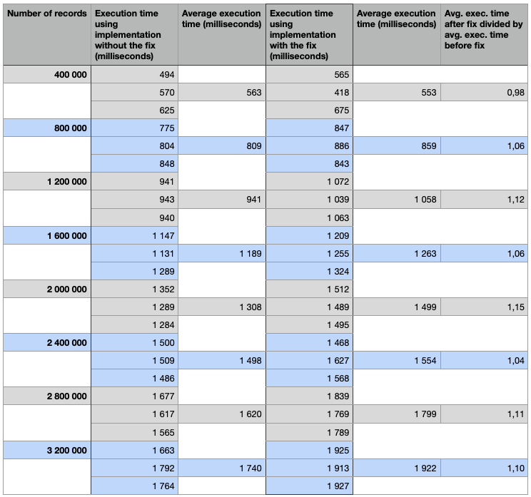 I created a test class to measure the performance before and after the change. The source code of the test is available here: https://gist.github.com/pgyori/5fa9499182d544f12ce2e5deeeba6d00  Attached the results of my measurements before and after the fix. In my tests execution time increased by 6%-15%. I did not experience any change in memory consumption. -- This is an automated message from the Apache Git Service. To respond to the message, please log on to GitHub and use the URL above to go to the specific comment. For queries about this service, please contact Infrastructure at: [email protected]