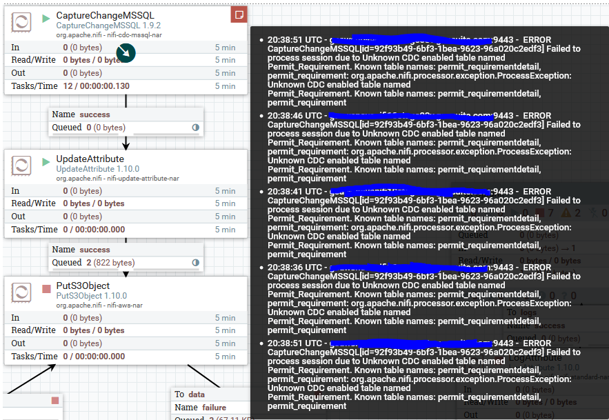 readl1 commented on issue #2231: NIFI-4521 MS SQL CDC Processor URL: https://github.com/apache/nifi/pull/2231#issuecomment-572240084 I have been using the MS CDC processor for ~4 months now. I have noticed what I think is a bug in the cdc processor. When I use more than one table in the CDC table list I get an error and no CDC tables are read. The data in the queue below is from removing one of the tables from the list, both tables work independently. I am using nifi v1.10.0, CDC MSSQL v1.9.2