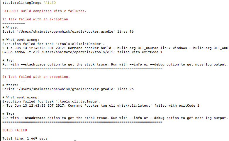 mateenrehan commented on issue #2355: Can not find bin/mac/amd64/wsk URL: https://github.com/apache/incubator-openwhisk/issues/2355#issuecomment-308177790 Additonal Information: I even tried the `gradle tools:cli:distDocker -P crossCompileCLI=true` and I my build was failed with the following error:  ---------------------------------------------------------------- This is an automated message from the Apache Git Service. To respond to the message, please log on GitHub and use the URL above to go to the specific comment. For queries about this service, please contact Infrastructure at: [email protected]