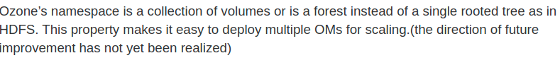 ## What changes were proposed in this pull request? In the [OM](https://github.com/apache/ozone/blob/1a304ba81c9d52e2fb3a67e669d08c729a4113ae/hadoop-hdds/docs/content/concept/OzoneManager.md) part of the Ozone document, OM federation is not implemented, but there is no remarks, which will cause users to mislead when reading. **Solution: clarify that this is the possibility of future improvement by adding a note after this paragraph.** **If OM federation is successfully implemented in the future, delete this sentence.** ## What is the link to the Apache JIRA https://issues.apache.org/jira/projects/HDDS/issues/HDDS-5610 ## How was this patch tested? Local hugo pass.   -- This is an automated message from the Apache Git Service. To respond to the message, please log on to GitHub and use the URL above to go to the specific comment. To unsubscribe, e-mail: [email protected] For queries about this service, please contact Infrastructure at: [email protected] --------------------------------------------------------------------- To unsubscribe, e-mail: [email protected] For additional commands, e-mail: [email protected]