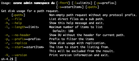 `ozone admin namespace [summary | du | quota | dist] [-options] <path>`