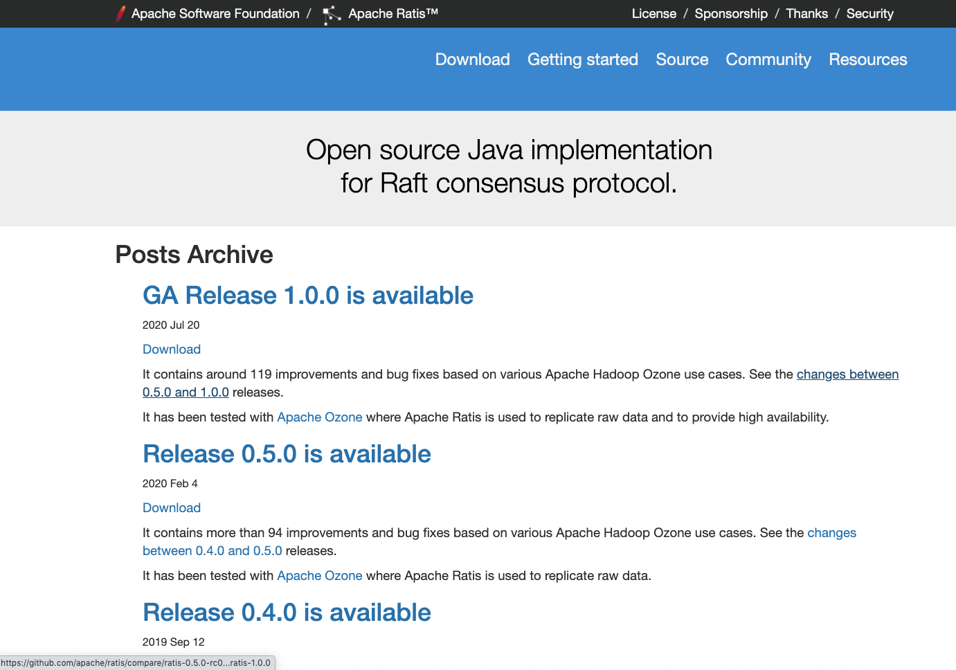 ## What changes were proposed in this pull request? The site has posts for release announcements with download links pointing to an old incubator location. Update these links to point to the new TLP location. While working on this, I also noticed there were links to Ozone documentation at the old location under the hadoop sub-domain. I updated all of those to use Ozone's TLP site: ozone.apache.org. ## What is the link to the Apache JIRA https://issues.apache.org/jira/browse/RATIS-1337 ## How was this patch tested? Built site locally and verified all links point to the correct locations. (Note link target displayed at bottom of screenshot.)  ---------------------------------------------------------------- This is an automated message from the Apache Git Service. To respond to the message, please log on to GitHub and use the URL above to go to the specific comment. For queries about this service, please contact Infrastructure at: [email protected]