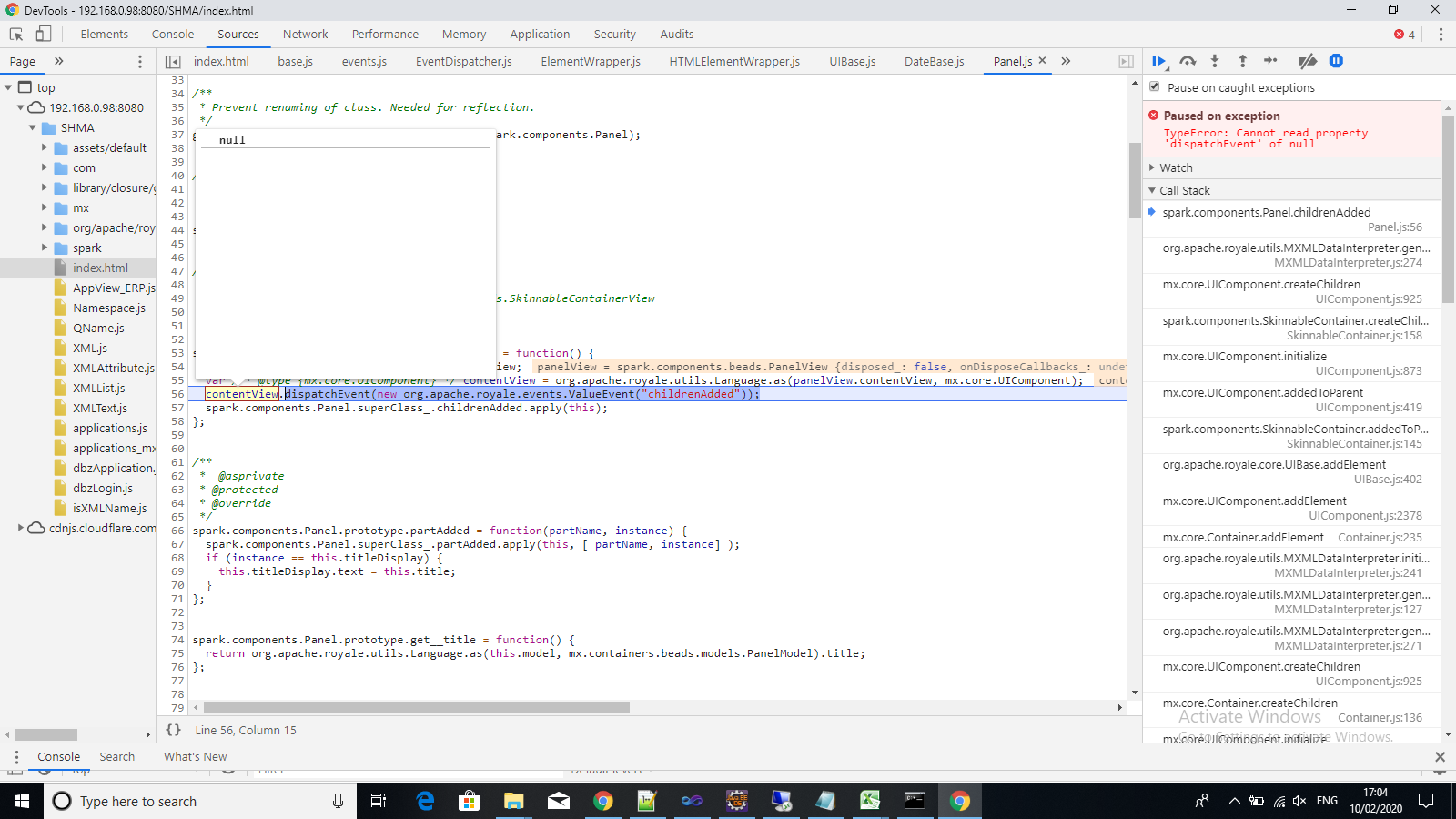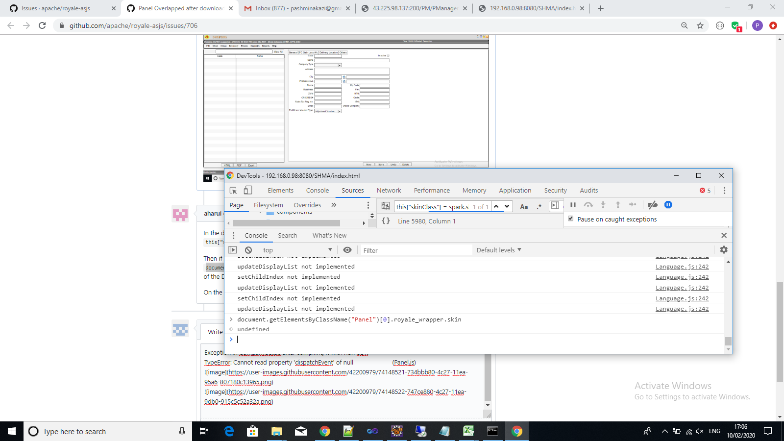 pashminakazi commented on issue #706: Panel Overlapped after downloading new SDK URL: https://github.com/apache/royale-asjs/issues/706#issuecomment-584092495 I have compiled CompanySetup on my local machine Exception in CompanySetup after compiling it with new SDK TypeError: Cannot read property 'dispatchEvent' of null (Panel.js)   after executing document.getElementsByClassName("Panel")[0].royale_wrapper.skin in Console