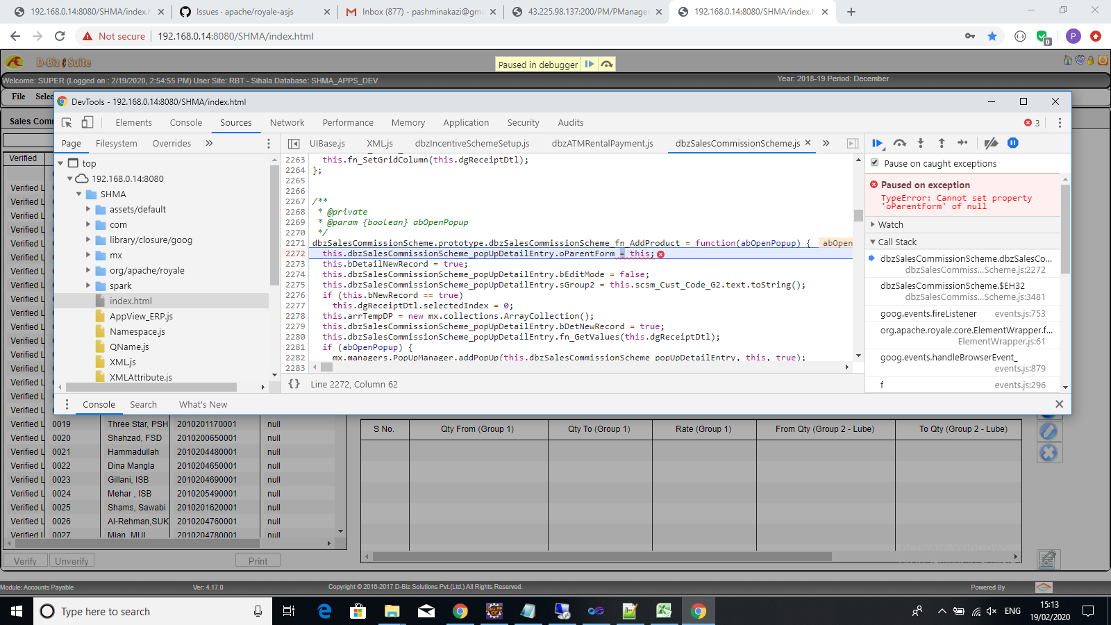 pashminakazi opened a new issue #725: TypeError: Cannot set property 'oParentForm' of null URL: https://github.com/apache/royale-asjs/issues/725 Project Details are : https://paste.apache.org/cpo8y Test case is available on VDI. Go to Accounts Payable from Select in Menu Go to Sales Commission Scheme from Setups in Menu File : com/dbz/modules/AR/dbzSalesCommissionScheme.mxml popUpDetailEntry = new dbzSalesCommissionSchemeDetail(); popUpDetailEntry.oParentForm = this; oParentForm is defined in dbzSalesCommissionSchemeDetail [Bindable] public var oParentForm:Object = null; On Clicking **Plus (+)** button for detail grid function called **fn_AddProduct** and which is setting **popUpDetailEntry.oParentForm = this;** and then this exception occurs