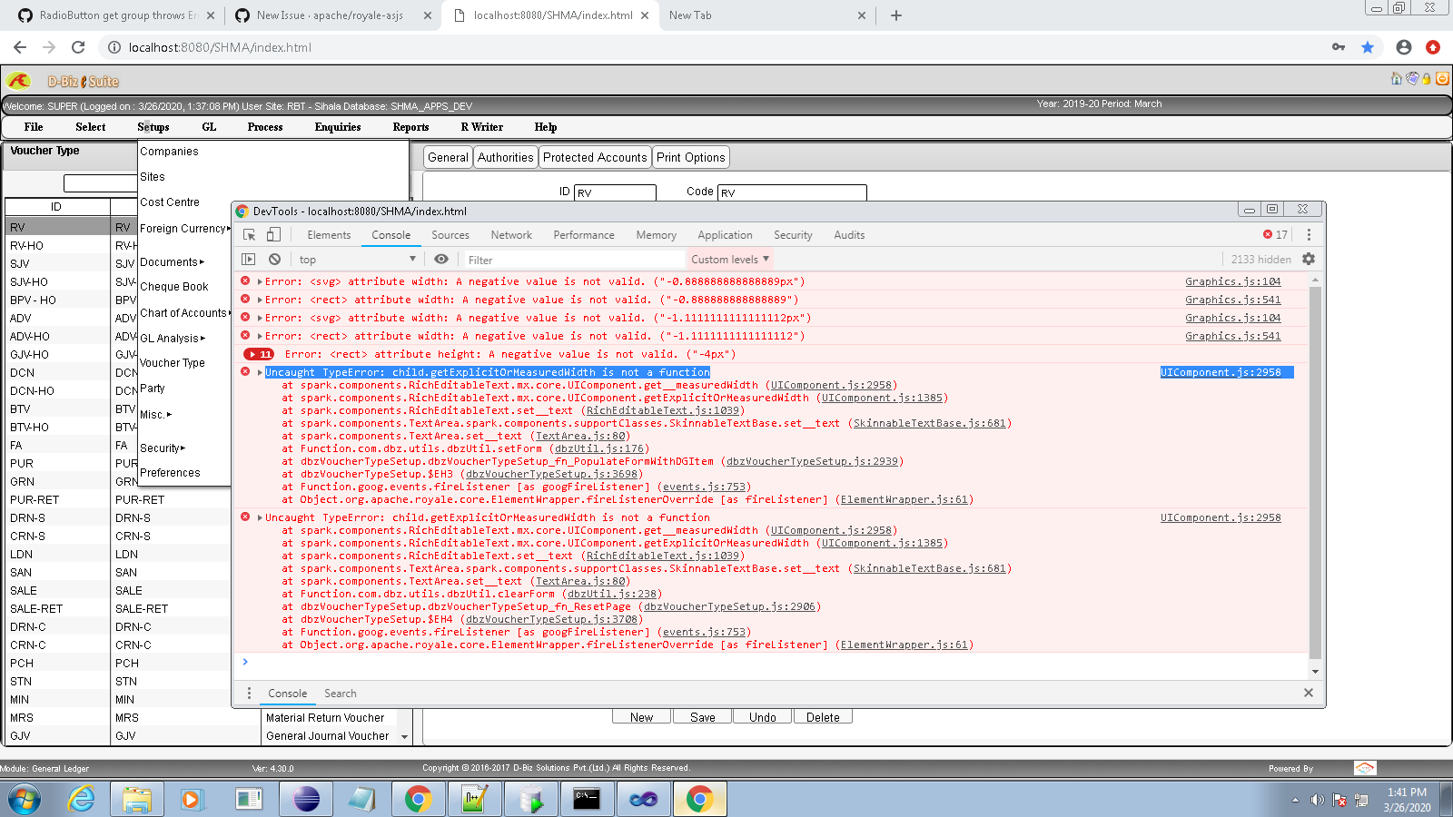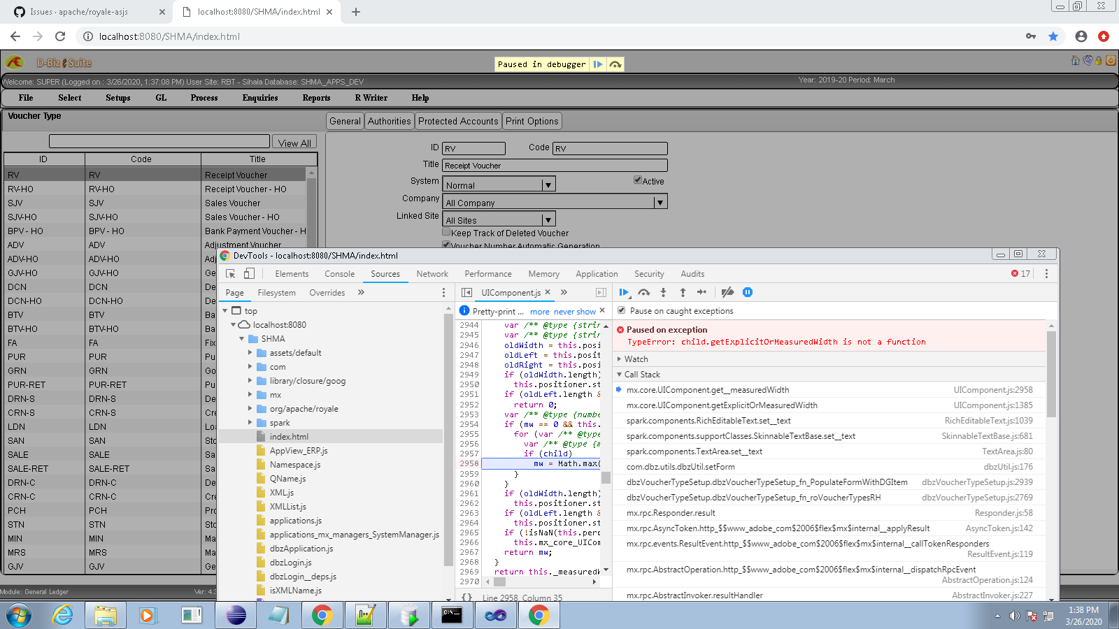 pashminakazi opened a new issue #789: Uncaught TypeError: child.getExplicitOrMeasuredWidth is not a function (UIComponent.js:2958) URL: https://github.com/apache/royale-asjs/issues/789 Project Details are : https://paste.apache.org/cpo8y Test case is available on VDI. Go to General Ledger from Select in Menu Go to Voucher Type from Setups in Menu File : com/dbz/modules/GL/dbzVoucherTypeSetup.mxml