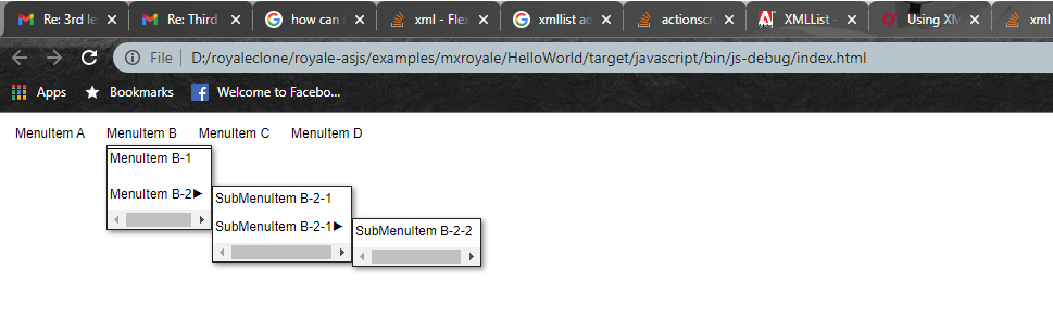 Alex , tried a solution/work around for 3rd level menu items .. I changed Array to XMLListCollection and it worked till 3rd level menu items. menu items are shown.  I will try and check also what you have suggested. Thanks a lot ---------------------------------------------------------------- This is an automated message from the Apache Git Service. To respond to the message, please log on to GitHub and use the URL above to go to the specific comment. For queries about this service, please contact Infrastructure at: [email protected]