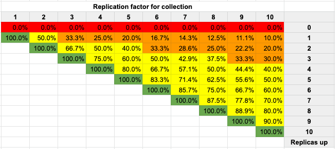 Thanks for input. Here is Houston's proposal in the sheet:  (The sheet is here https://docs.google.com/spreadsheets/d/117R33zSFb10D5Jq5agOrgC7nMv74mQmiLssmLk_6YkA/edit?usp=sharing if you want to experiment. Go to Format->Conditional formatting to change rules) If we are to distinguish between yellow and orange, I think Houston's proposal makes more sense. I.e. for a 3-replica collection you go yellow when losing one replica and orange when only 1/3 is left. And OPS people who are easily scared can always setup warn alarms for situations where YELLOW state persists for several minutes. For a 2-replica collection, you could argue that losing 50% of the replicas and having only one left warrants orange since you're down with only one failure. Setting orange 1-50% and yellow 51-99% would account for that? -- This is an automated message from the Apache Git Service. To respond to the message, please log on to GitHub and use the URL above to go to the specific comment. For queries about this service, please contact Infrastructure at: [email protected] --------------------------------------------------------------------- To unsubscribe, e-mail: [email protected] For additional commands, e-mail: [email protected]