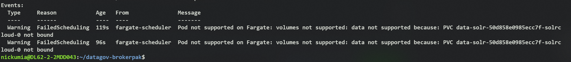 Hmmm.... so upon further research, it seems like there's a race condition happening in either the `solr` or `solr-operator` helm charts. Inspecting the pvc that `solr` tries to create,  Inspecting the pod that `solr-operator` tries to create, <details> <summary> Full Pod Inspection </summary> ``` nickumia@DL62-2-2MDD043:~/datagov-brokerpak$ kubectl describe pods solr-50d858e0985ecc7f-solrcloud-0 Name: solr-50d858e0985ecc7f-solrcloud-0 Namespace: default Priority: 2000001000 Priority Class Name: system-node-critical Node: <none> Labels: app.kubernetes.io/instance=solr-50d858e0985ecc7f app.kubernetes.io/managed-by=Helm app.kubernetes.io/name=solr app.kubernetes.io/version=8.9.0 controller-revision-hash=solr-50d858e0985ecc7f-solrcloud-74f75459bd eks.amazonaws.com/fargate-profile=default-namespaces-k8s-5fcb154753056b9c helm.sh/chart=solr-0.5.0 solr-cloud=solr-50d858e0985ecc7f statefulset.kubernetes.io/pod-name=solr-50d858e0985ecc7f-solrcloud-0 technology=solr-cloud Annotations: kubernetes.io/psp: eks.privileged solr.apache.org/nextScheduledRestart: 2022-01-28T23:20:00Z solr.apache.org/solrXmlMd5: 843652bc6b529b66f46bcdae6764ab4e Status: Pending IP: IPs: <none> Controlled By: StatefulSet/solr-50d858e0985ecc7f-solrcloud Init Containers: cp-solr-xml: Image: library/busybox:1.28.0-glibc Port: <none> Host Port: <none> Command: sh -c cp /tmp/solr.xml /tmp-config/solr.xml Environment: <none> Mounts: /tmp from solr-xml (rw) /tmp-config from data (rw) /var/run/secrets/kubernetes.io/serviceaccount from default-token-qzccw (ro) setup-zk: Image: docker.io/solr:8.11 Port: <none> Host Port: <none> Command: sh -c ZK_SECURITY_JSON=$(/opt/solr/server/scripts/cloud-scripts/zkcli.sh -zkhost ${ZK_HOST} -cmd get /security.json); if [ ${#ZK_SECURITY_JSON} -lt 3 ]; then echo $SECURITY_JSON > /tmp/security.json; /opt/solr/server/scripts/cloud-scripts/zkcli.sh -zkhost ${ZK_HOST} -cmd putfile /security.json /tmp/security.json; echo "put security.json in ZK"; fi Environment: ZK_HOST: solr-50d858e0985ecc7f-solrcloud-zookeeper-0.solr-50d858e0985ecc7f-solrcloud-zookeeper-headless.default.svc.cluster.local:2181,solr-50d858e0985ecc7f-solrcloud-zookeeper-1.solr-50d858e0985ecc7f-solrcloud-zookeeper-headless.default.svc.cluster.local:2181,solr-50d858e0985ecc7f-solrcloud-zookeeper-2.solr-50d858e0985ecc7f-solrcloud-zookeeper-headless.default.svc.cluster.local:2181/ ZK_CHROOT: / ZK_SERVER: solr-50d858e0985ecc7f-solrcloud-zookeeper-0.solr-50d858e0985ecc7f-solrcloud-zookeeper-headless.default.svc.cluster.local:2181,solr-50d858e0985ecc7f-solrcloud-zookeeper-1.solr-50d858e0985ecc7f-solrcloud-zookeeper-headless.default.svc.cluster.local:2181,solr-50d858e0985ecc7f-solrcloud-zookeeper-2.solr-50d858e0985ecc7f-solrcloud-zookeeper-headless.default.svc.cluster.local:2181 SECURITY_JSON: <set to the key 'security.json' in secret 'solr-50d858e0985ecc7f-solrcloud-security-bootstrap'> Optional: false Mounts: /var/run/secrets/kubernetes.io/serviceaccount from default-token-qzccw (ro) Containers: solrcloud-node: Image: docker.io/solr:8.11 Port: 8983/TCP Host Port: 0/TCP Requests: cpu: 1 memory: 1G Liveness: http-get http://:8983/solr/admin/info/system delay=20s timeout=1s period=10s #success=1 #failure=3 Readiness: http-get http://:8983/solr/admin/info/system delay=15s timeout=1s period=5s #success=1 #failure=3 Environment: SOLR_JAVA_MEM: -Xms300m -Xmx300m SOLR_HOME: /var/solr/data SOLR_PORT: 8983 SOLR_NODE_PORT: 80 POD_HOSTNAME: solr-50d858e0985ecc7f-solrcloud-0 (v1:metadata.name) SOLR_HOST: default-$(POD_HOSTNAME).sub-nickumia40.ssb-dev.data.gov SOLR_LOG_LEVEL: INFO GC_TUNE: SOLR_STOP_WAIT: 55 ZK_HOST: solr-50d858e0985ecc7f-solrcloud-zookeeper-0.solr-50d858e0985ecc7f-solrcloud-zookeeper-headless.default.svc.cluster.local:2181,solr-50d858e0985ecc7f-solrcloud-zookeeper-1.solr-50d858e0985ecc7f-solrcloud-zookeeper-headless.default.svc.cluster.local:2181,solr-50d858e0985ecc7f-solrcloud-zookeeper-2.solr-50d858e0985ecc7f-solrcloud-zookeeper-headless.default.svc.cluster.local:2181/ ZK_CHROOT: / ZK_SERVER: solr-50d858e0985ecc7f-solrcloud-zookeeper-0.solr-50d858e0985ecc7f-solrcloud-zookeeper-headless.default.svc.cluster.local:2181,solr-50d858e0985ecc7f-solrcloud-zookeeper-1.solr-50d858e0985ecc7f-solrcloud-zookeeper-headless.default.svc.cluster.local:2181,solr-50d858e0985ecc7f-solrcloud-zookeeper-2.solr-50d858e0985ecc7f-solrcloud-zookeeper-headless.default.svc.cluster.local:2181 SOLR_OPTS: -DhostPort=$(SOLR_NODE_PORT) Mounts: /var/run/secrets/kubernetes.io/serviceaccount from default-token-qzccw (ro) /var/solr/data from data (rw) Conditions: Type Status PodScheduled False Volumes: data: Type: PersistentVolumeClaim (a reference to a PersistentVolumeClaim in the same namespace) ClaimName: data-solr-50d858e0985ecc7f-solrcloud-0 ReadOnly: false solr-xml: Type: ConfigMap (a volume populated by a ConfigMap) Name: solr-50d858e0985ecc7f-solrcloud-configmap Optional: false default-token-qzccw: Type: Secret (a volume populated by a Secret) SecretName: default-token-qzccw Optional: false QoS Class: Burstable Node-Selectors: <none> Tolerations: node.kubernetes.io/not-ready:NoExecute op=Exists for 300s node.kubernetes.io/unreachable:NoExecute op=Exists for 300s Events: Type Reason Age From Message ---- ------ ---- ---- ------- Warning FailedScheduling 42m fargate-scheduler Pod not supported on Fargate: volumes not supported: data not supported because: PVC data-solr-50d858e0985ecc7f-solrcloud-0 not bound ``` </details>  From my understanding the order of operations is, 1. Create PV 2. Create PVC 3. Create Pod It seems like the pod is waiting for the PVC to be bound but the PVC is not getting bound because it's waiting for the pod to start up. This may only be an issue because of Fargate issues. I was trying to inspect the [solr helm chart](https://github.com/apache/solr-operator/blob/main/helm/solr/templates/solrcloud.yaml) for an order of operations, but didn't see anything that would represent an order of operations. Can you help verify that there aren't any complex