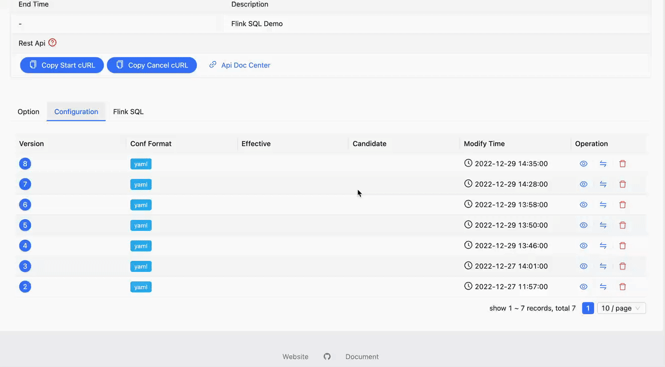 in the Configuration table of the Flink app details page and clicking the