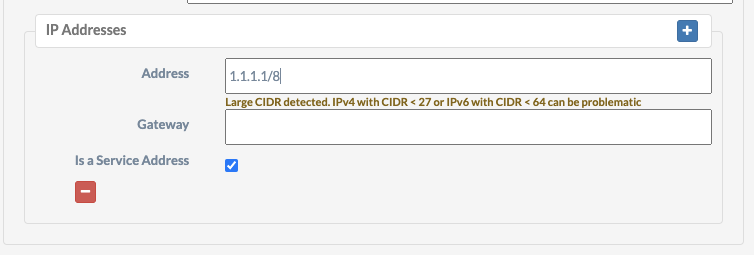 ^^ - [x] This PR fixes #5038 ## Which Traffic Control components are affected by this PR? - Traffic Portal ## What is the best way to verify this PR? Navigate to trafficportal.domain.com/#!/servers/new and create a server interface with an ipv4 or ipv6 address with the following: - if ipv4, enter CIDR under 27. i.e. 1.1.1.1/16 - if ipv6, enter CIDR under 64. i.e. aa::/32 and you'll see a warning message like such:  ## The following criteria are ALL met by this PR - [ ] This PR includes tests OR I have explained why tests are unnecessary - [ ] This PR includes documentation OR I have explained why documentation is unnecessary - [ ] This PR includes an update to CHANGELOG.md OR such an update is not necessary - [x] This PR includes any and all required license headers - [x] This PR ensures that database migration sequence is correct OR this PR does not include a database migration - [x] This PR **DOES NOT FIX A SERIOUS SECURITY VULNERABILITY** (see [the Apache Software Foundation's security guidelines](https://www.apache.org/security/) for details) <!-- Licensed to the Apache Software Foundation (ASF) under one or more contributor license agreements. See the NOTICE file distributed with this work for additional information regarding copyright ownership. The ASF licenses this file to you under the Apache License, Version 2.0 (the "License"); you may not use this file except in compliance with the License. You may obtain a copy of the License at http://www.apache.org/licenses/LICENSE-2.0 Unless required by applicable law or agreed to in writing, software distributed under the License is distributed on an "AS IS" BASIS, WITHOUT WARRANTIES OR CONDITIONS OF ANY KIND, either express or implied. See the License for the specific language governing permissions and limitations under the License. --> ---------------------------------------------------------------- This is an automated message from the Apache Git Service. To respond to the message, please log on to GitHub and use the URL above to go to the specific comment. For queries about this service, please contact Infrastructure at: [email protected]